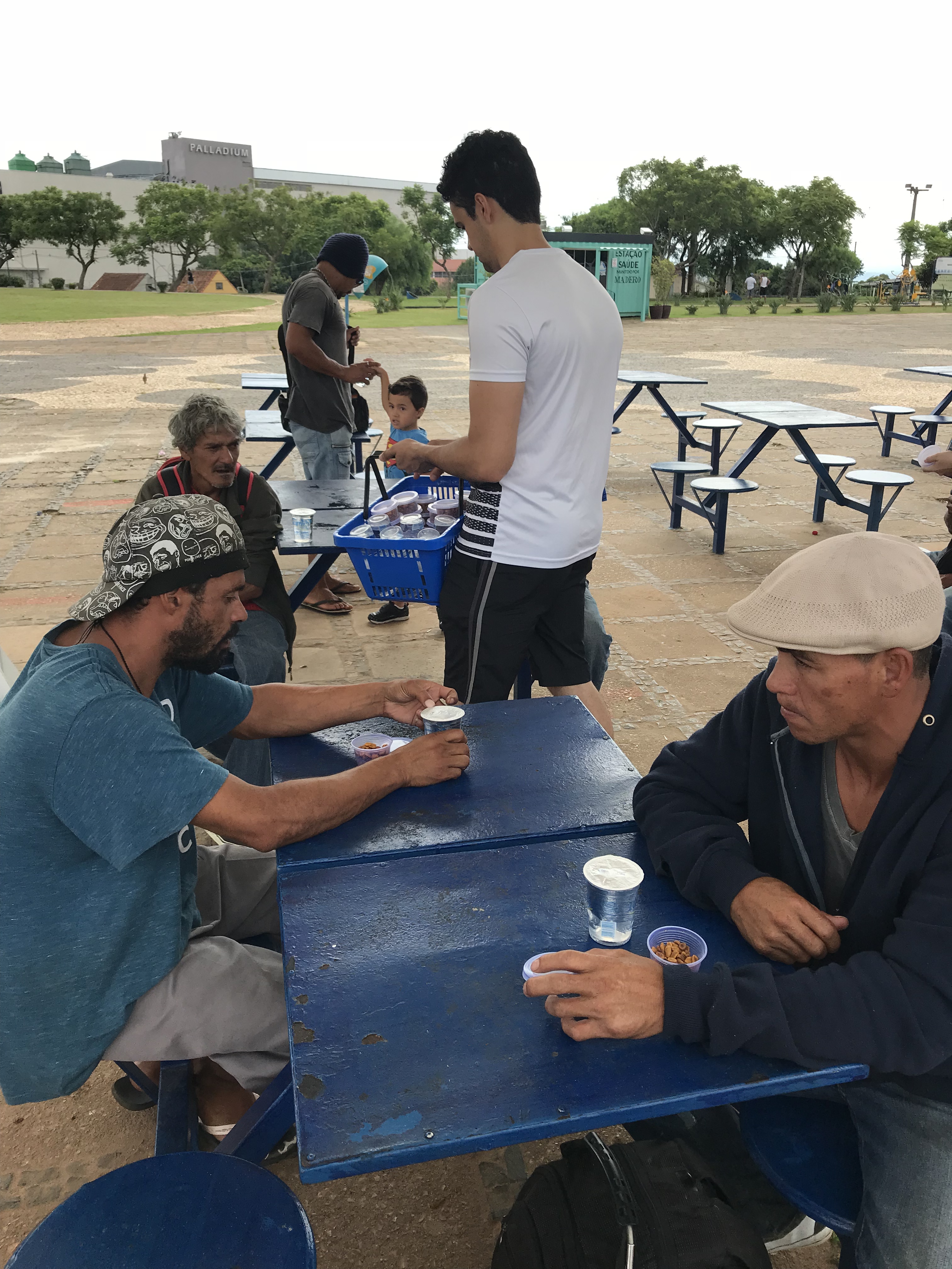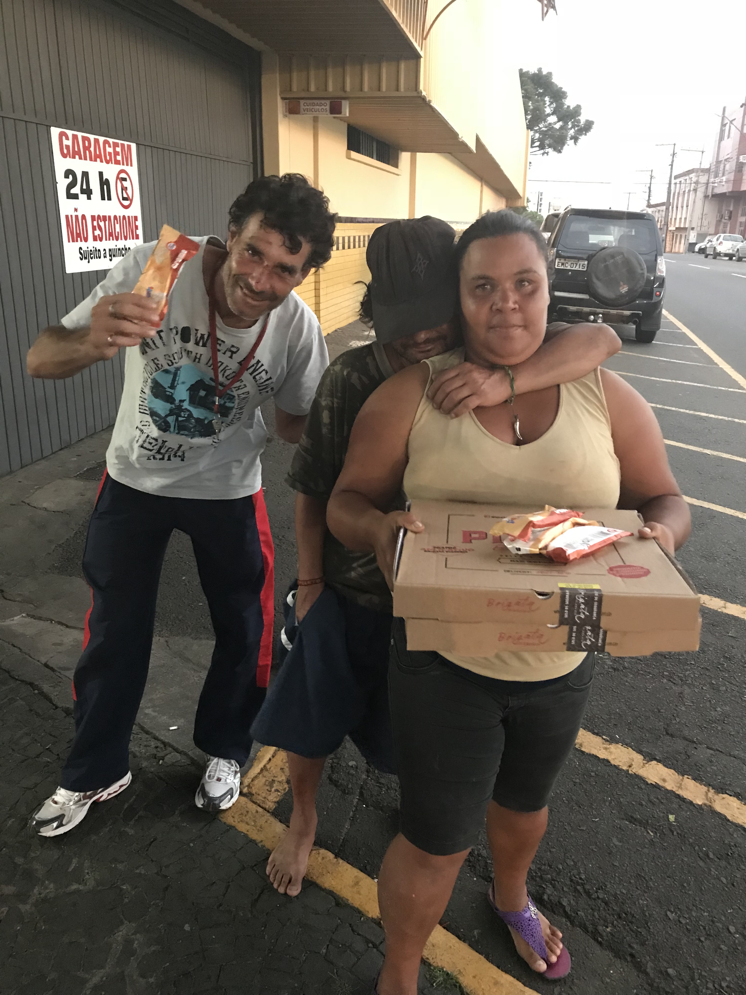 No primeiro dia, sexta-feira (25), tivemos a colaboração da Soup Truck, que distribuiu 15 sopas de feijão na hora do almoço na região central. Mais tarde, entramos em ação com a Brigata e 40 pizzas quentinhas, além de 100 picolés doados pela Polar Sorvetes Santos Dumont. Circulamos por Oficinas, Vila Estrela e Centro.