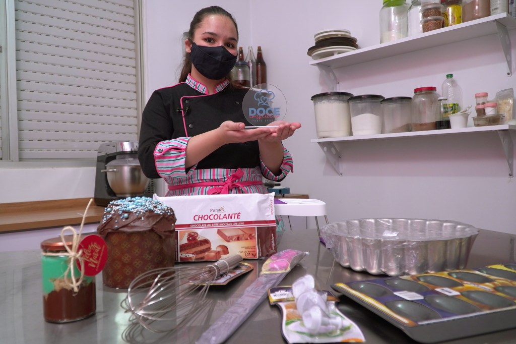 A jovem confeiteira Kawany Colheri foi desafiada a criar uma receita especial, após ganhar a terceira edição do concurso O Doce Confeiteiro, promovido pela página Onde Comer PG e pela loja Doce Confeitar. Ela recebeu três ingredientes neste desafio e, assim, criou um Panetone de Brigadeiro de Algodão Doce com Ganache de Chocolate Meio Amargo.