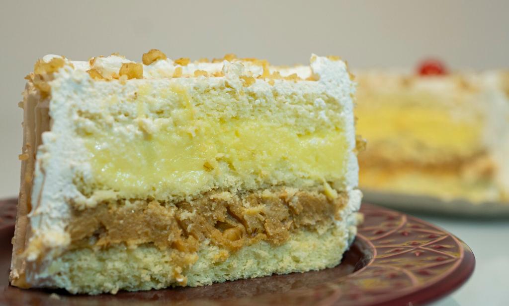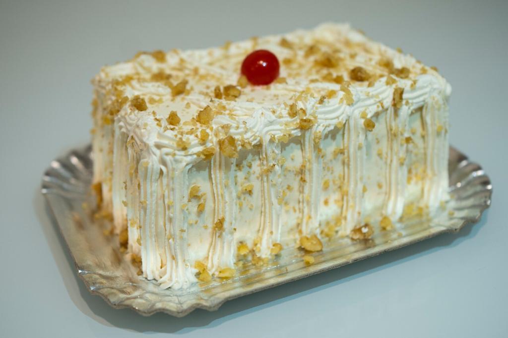 Os apaixonados por nozes são completamente fisgados por esse sabor de bolo. Ele leva pão de ló branco, recheio de doce de leite e nozes, mais um recheio de baba de moça. A cobertura é feita com mousse branco com nozes e cereja. Aquele doce na medida certa com a elegância das nozes.