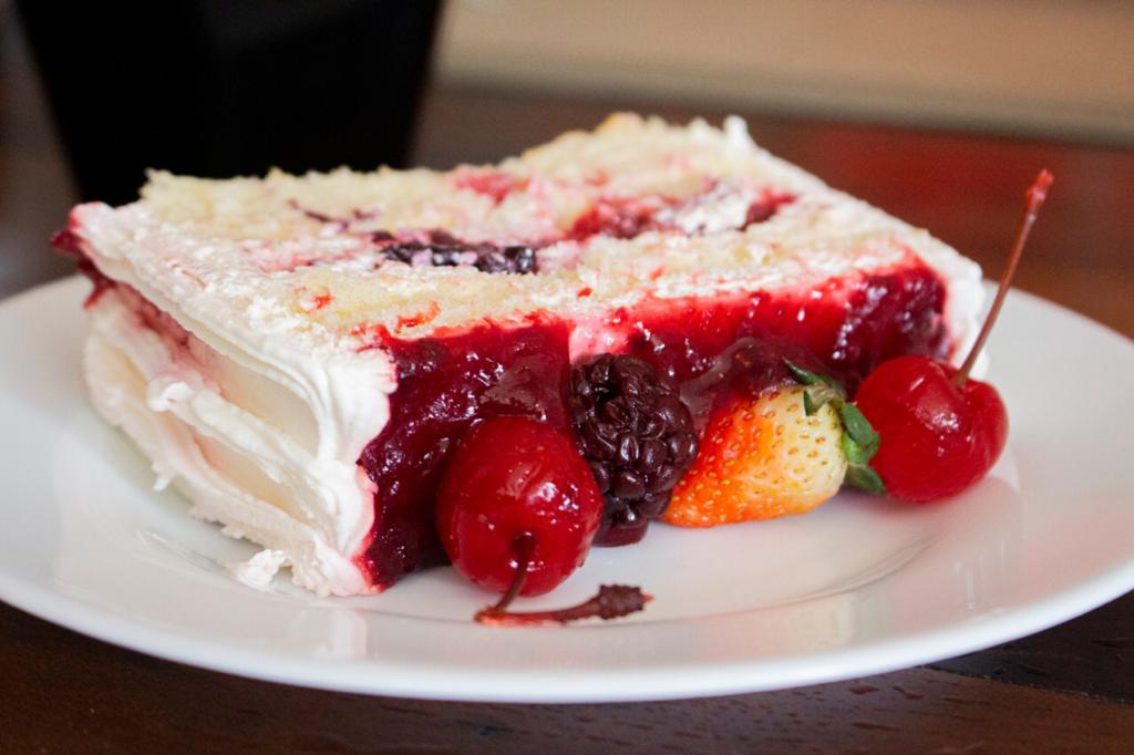 Quem é fã de frutas vermelhas, como nós somos, precisa provar esse bolo. Ele leva pão de ló branco, recheio de trufa branca, mais um recheio de mousse branco com geleia de frutas vermelhas, frutas vermelhas, além da cobertura de mousse branco, com geleia e frutas vermelhas. É realmente imperdível! Um bolo que combina o azedinho das frutas com o doce da trufa.