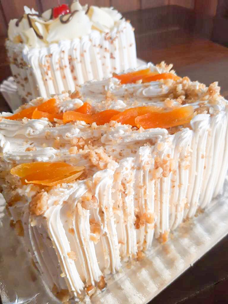 Outro bolo que todo mundo precisa provar, segundo a Dona Padoca, é o de Nozes com Damasco. É simplesmente surpreendente, além de todo o requinte que esses dois ingredientes proporcionam. Ele leva pão de ló branco, recheio de trufa branca com nozes, mais um recheio de mousse branco e damascos. A cobertura é feita com mousse branco com nozes, damasco e cereja.