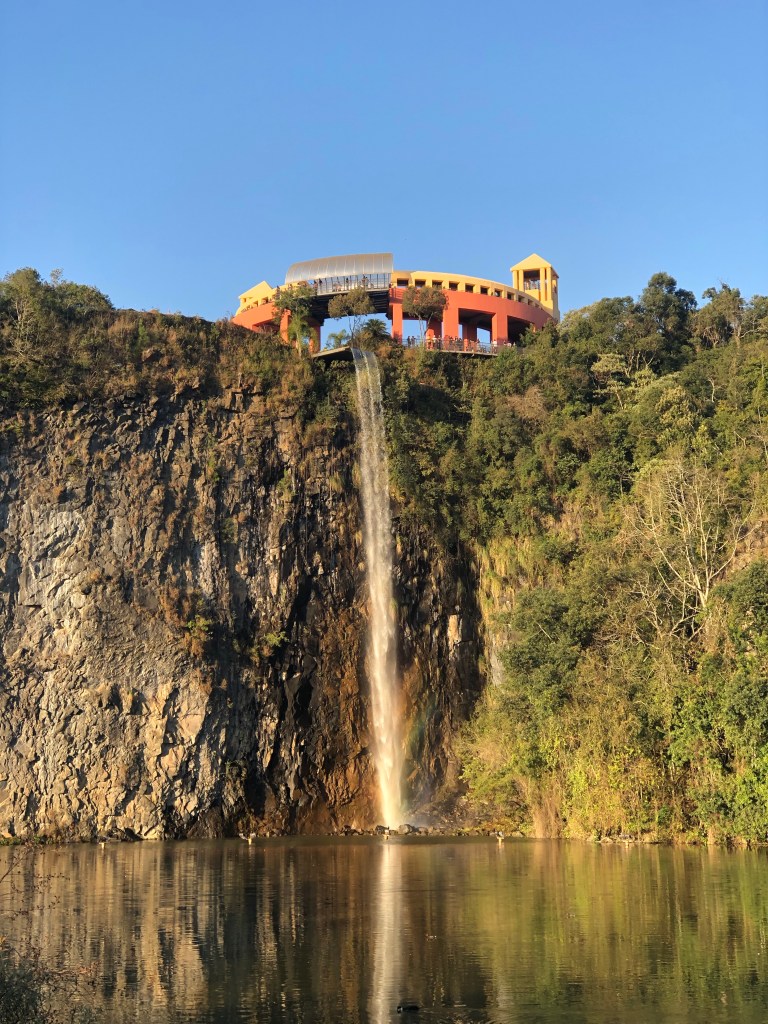 Antes ainda do sol se esconder inteiramente, fomos adiante, próximo à cascata, para apreciar o céu alaranjado mais de perto. Se você tem vertigem, não vá, pois o piso é em grade, onde você enxerga embaixo. A vista é maravilhosa! Só aí já valeu nossa viagem relâmpago.