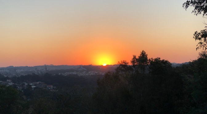Chegamos praticamente no momento exato do pôr do sol. Nos aproximamos da cascata, mas chegamos a conclusão de que o lugar mais lindo pra vê-lo e fazer fotos é da escadaria. Fica uma galera sentada lá, apreciando esse momento divino! É de tirar o fôlego, principalmente no céu de inverno, né?