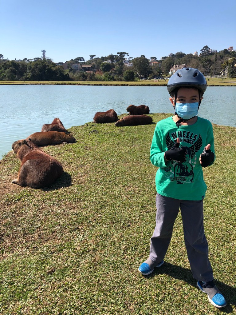 Logo avistamos as capivaras e fomos mostrar para o Davi, que nunca tinha visto. Claro, Felícia do jeito que é, queria passar a mão nelas. Não deixamos, mas achou uma fofura todas juntas tomando banho de sol. Quem não acha fofos esses “hamsters gigantes” (como um dia disseram os estrangeiros), né?