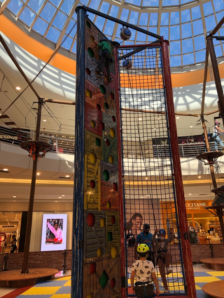 Saindo do Outback, que fica no Park Gourmet, descemos ao térreo. Sabíamos que estava rolando uma atração para as crianças, onde eles sempre montam a árvore de Natal. Era um circuito de escalada e aventura.