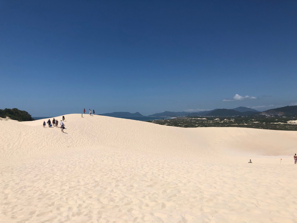 O 2º dia era o aniversário da pessoa que vos escreve. Então, programamos nossa ida à Praia de Joaquina, ver as dunas e aproveitar a praia. Fica bem longe de onde estávamos, indo para o sul. Logo nas dunas, você pode alugar pranchas por R$ 35 no cartão e R$ 30 no dinheiro. Pede a ajuda do instrutor e desce na alegria. Depois, pede a ajuda de Deus e sobe pra fazer de novo.