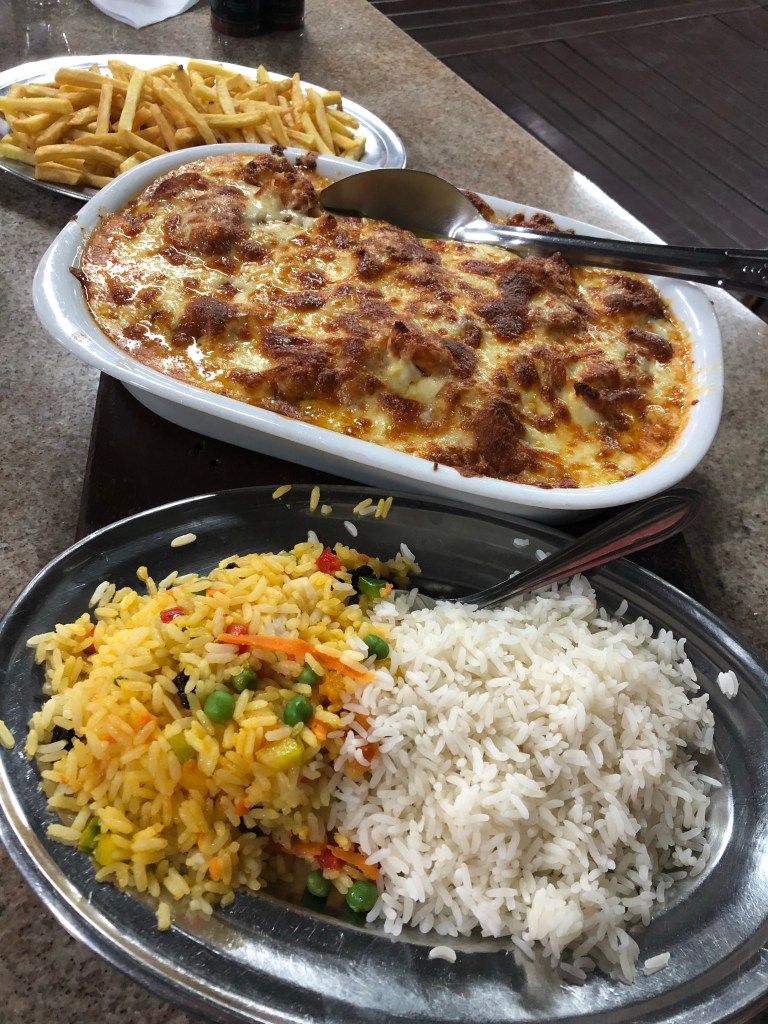 Como no dia anterior tínhamos comido camarão à milanesa, optamos por provar o camarão à parmegiana. Pedimos um prato para duas pessoas, que servia quatro tranquilamente. Estava muito maravilhoso, com muito queijo e molho. Veio junto arroz branco, arroz à grega e batatas fritas. Pedimos uma coca de 2 litros, porque o valor valia a pena. Depois, levamos para o hotel o que sobrou.