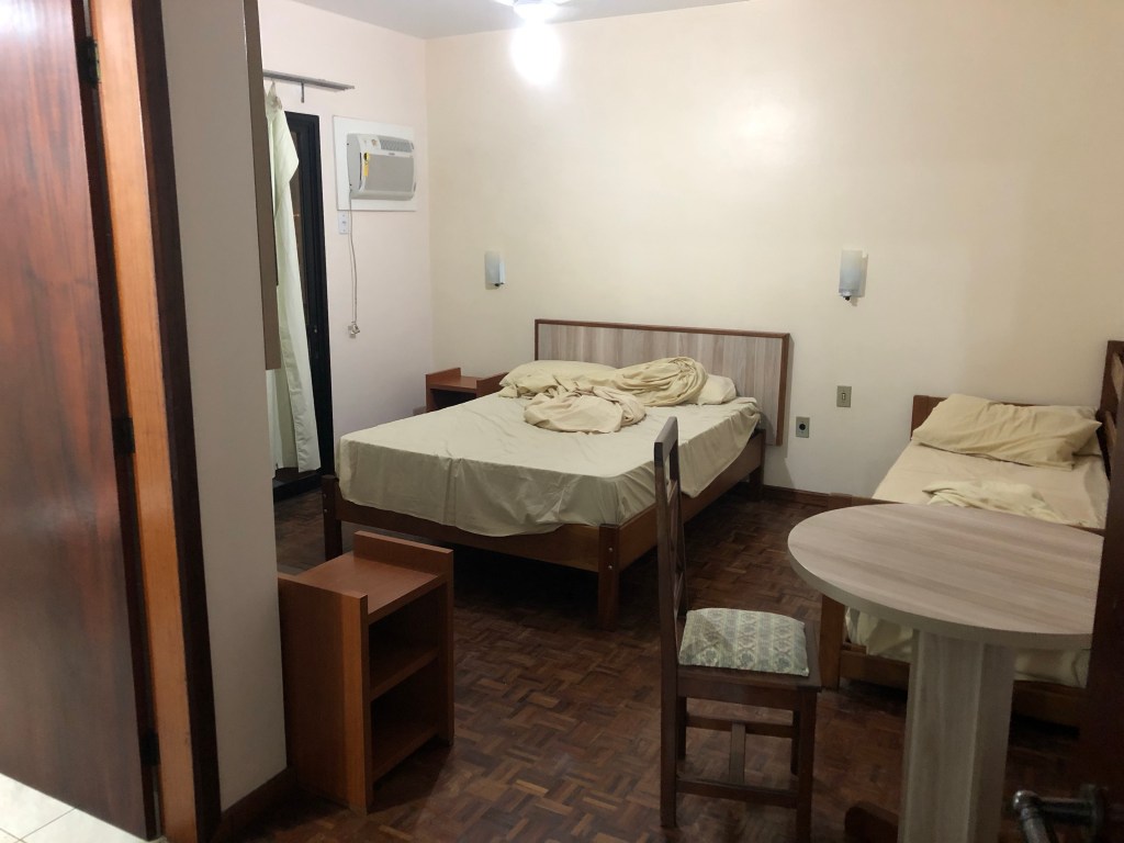 O quarto em que ficamos era espaçoso, com cama de casal e uma bicama, além de banheiro com um chuveiro de alta pressão, sacada, ar-condicionado, ventilador de teto, mesa e TV. Simples, porém confortável, com colchão bom! Na área comum, sala de jogos, churrasqueira, três piscinas (uma com toboágua) e garagem. O pessoal foi muito atencioso.