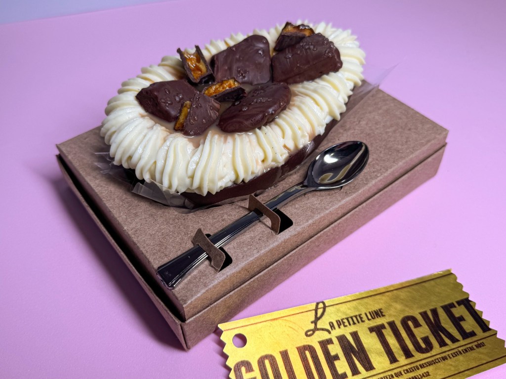 Em cada colherada, você percebe que cada ingrediente foi pensado para ser consumido com todas as camadas ao mesmo tempo. O honeycomb é um dos doces mais surpreendentes. Ele lembra um suspiro, um algodão doce, mas é super crocante e especial. Tem na decoração e no meio do recheio. É um vício! Ah… E ovo vem acompanhado do bilhete dourado.