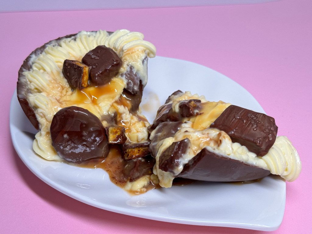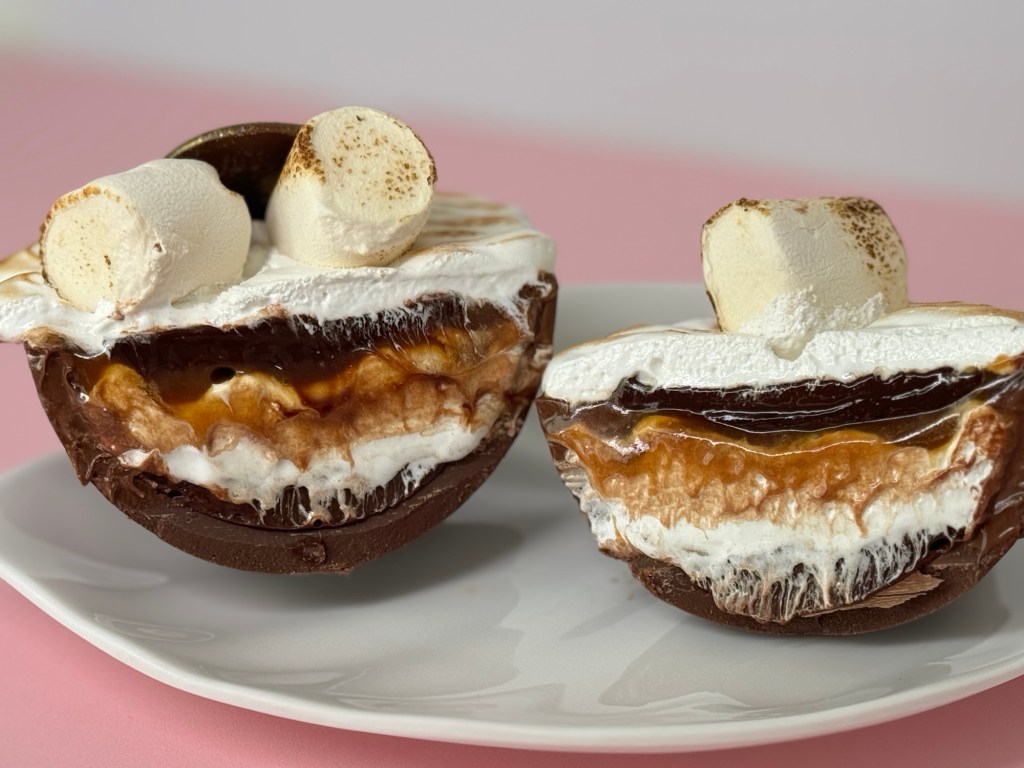 O valor do ovo de colher S’Mores com Caramelo é R$ 99,90. A casca pode ser escolhida pelo cliente, entre ao leite, meio amargo, branco e cookies. A nossa foi meio amargo. O peso total da categoria “ovos de colher” é de 550g.