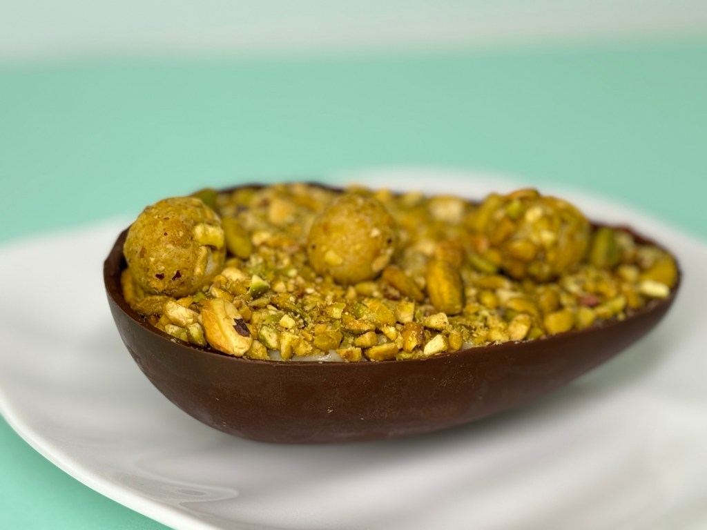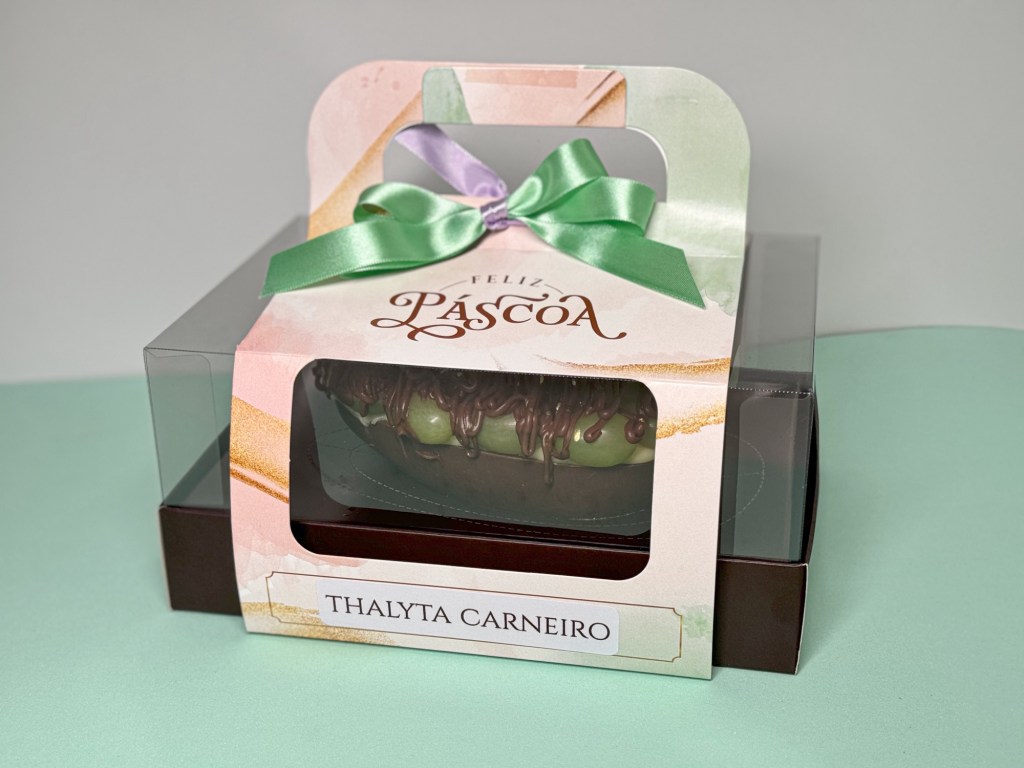 Esse ovo delicado possui um creme suave, com pedacinhos de pistache e é bem fácil de comer em uma sentada só. Se a pessoa presenteada não souber de que se trata de um ovo nessa pegada, não vai nem notar, por ter um sabor muito próximo a um doce tradicional.