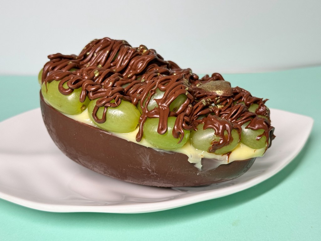 Por conta deste talento, a convidamos para fazer parte da nossa seleção de Páscoa de 2024. Ela vem com o sabor Uvachic, que tem casca ao leite Callebaut, crema, uvas verdes sem semente, finalizado com riscos de chocolate nobre.