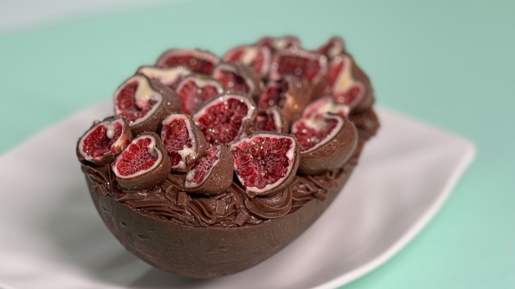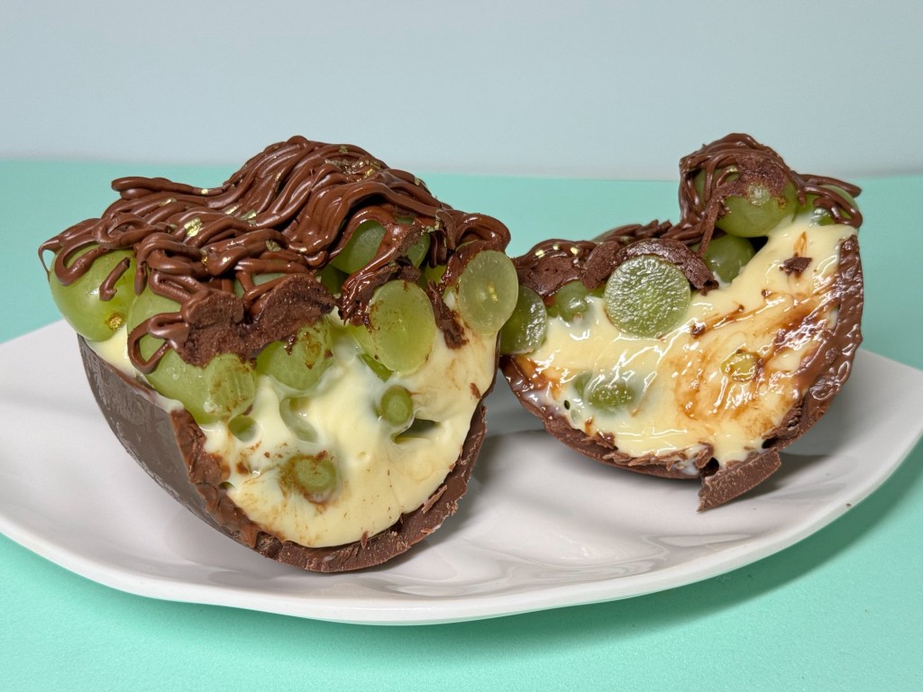 As meninas elaboraram um ovo gourmet que certamente será a sensação desta Páscoa de 2024. É o ovo Franuí, recheado com brigadeiro de ninho, geleia de framboesa e brigadeiro gourmet preto, decorado com o próprio Franuí e o glitter culinário, marca registrada delas.