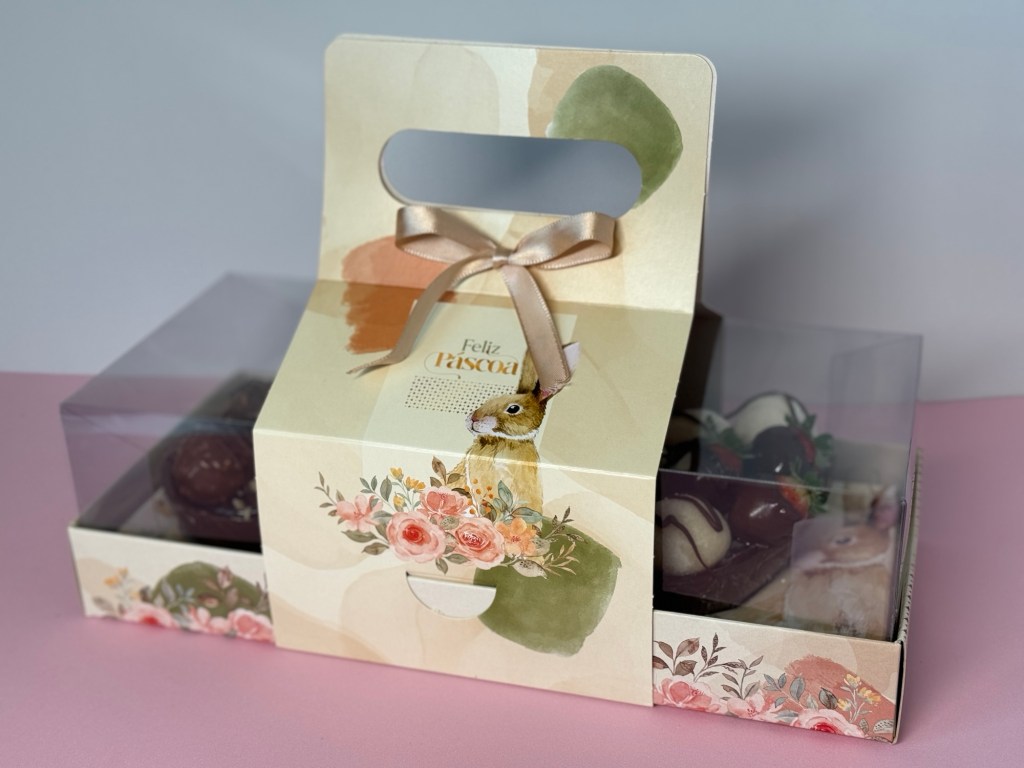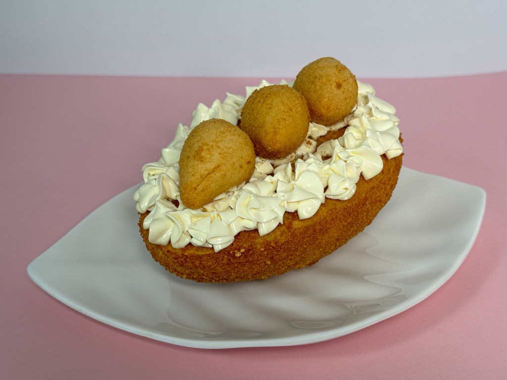 É um ovo com uma casquinha super crocante (você escuta no corte ou na mordida), tem um recheio molhadinho e bem temperado que fica ainda melhor com o requeijão. E o cream cheese é muito mais do que decorativo, ele traz um toque especial. O ovo vai em uma embalagem com o tema de Páscoa, como os doces.