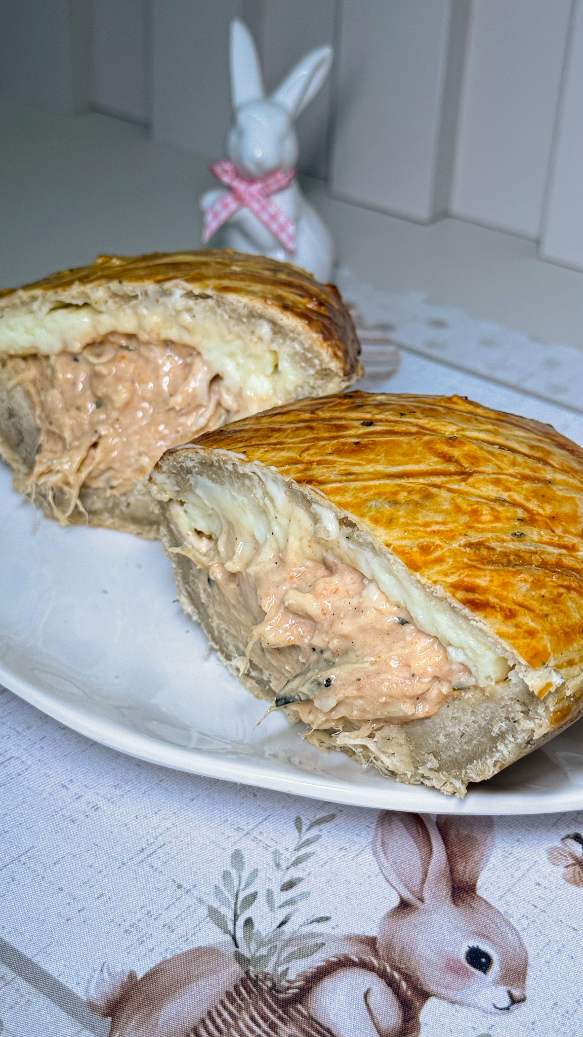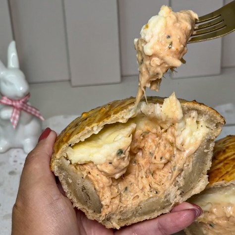 Ele é recheado com frango cremoso e catupiry original, feito com massa podre. Fica uma massa fininha por cima e o restante envolvendo o recheio, assim como um ovo tradicional de Páscoa. Chegou quentinho em nossa casa. O tempero estava delicioso, agradando especialmente o nosso filho mais velho, que não deixou um pedaço pra contar história.