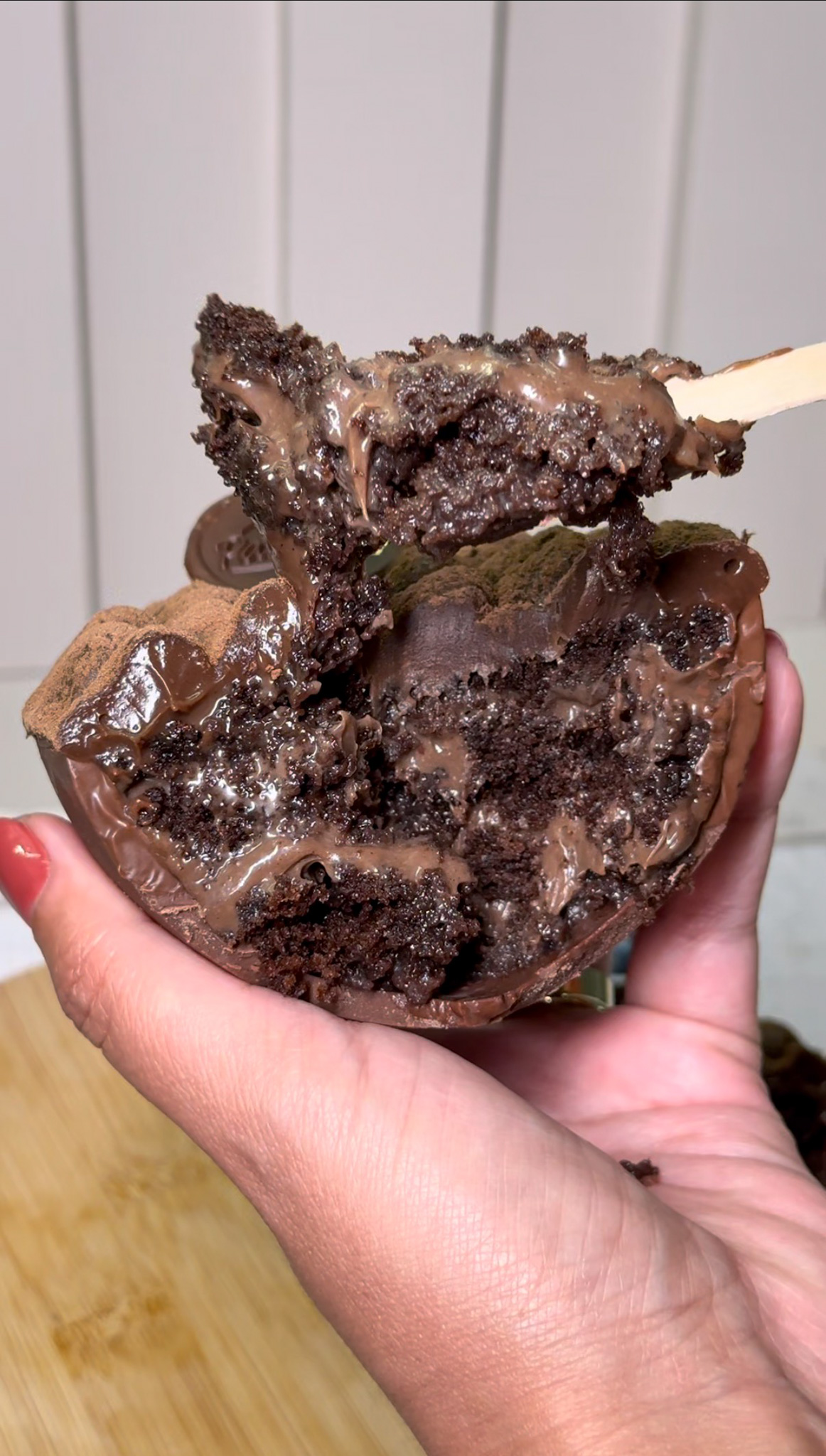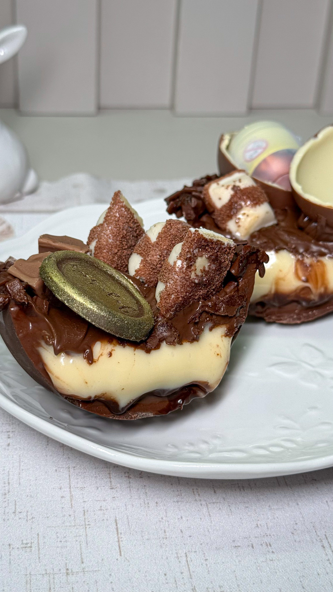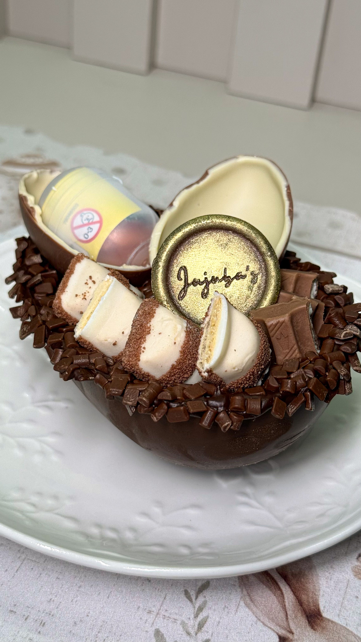 Ele leva uma casca de chocolate nobre blend, recheado com ganache meio amargo, creme de leite ninho e Nutella, finalizado com granulé nas bordas, Kinder ovo, Kinder Bueno, Kinder chocolate e moeda da marca.