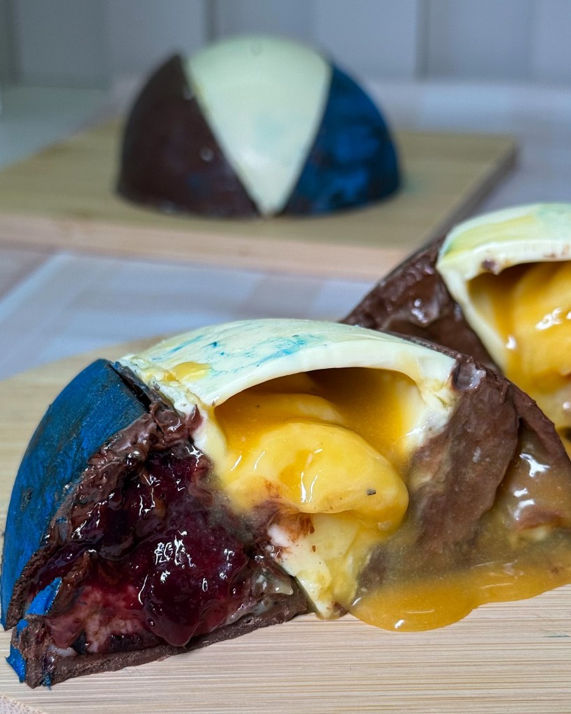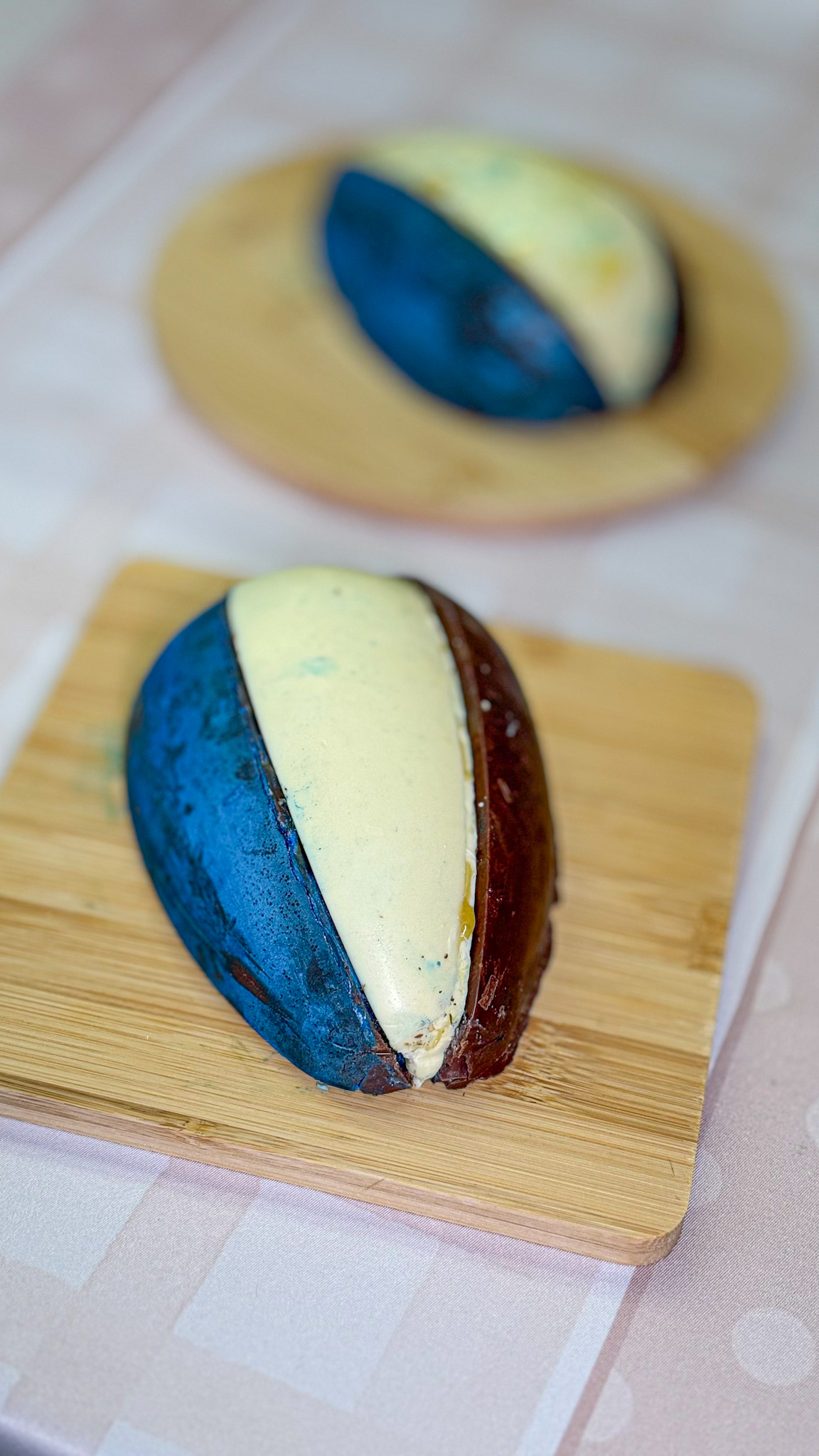 Acompanhando a tendência nacional, a La Lune apresenta o ovo em fatias, que podem ser encomendados com seis sabores diferentes do menu ou 3, como foi o nosso caso. Experimentamos de brigadeiro de maracujá na fatia de chocolate branco, brigadeiro de baunilha e frutas vermelhas na fatia de chocolate meio amargo e brigadeiro de avelãs e caramelo na fatia de chocolate meio amargo pintado de azul.