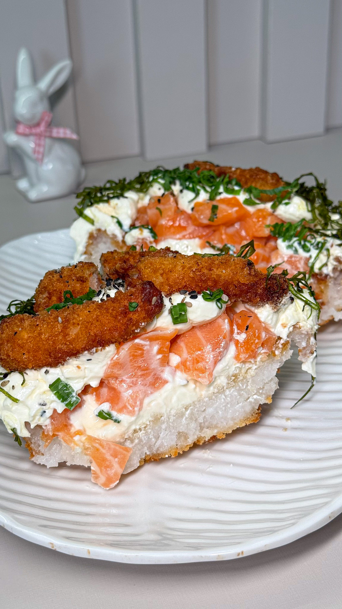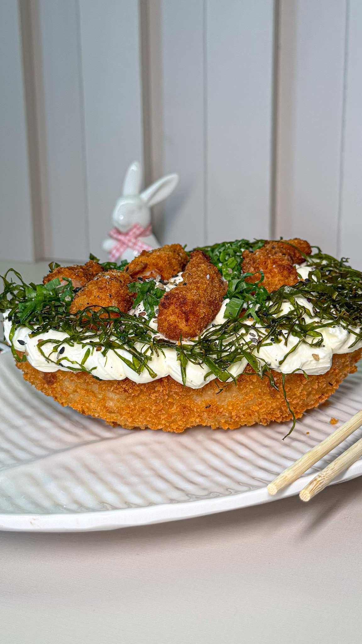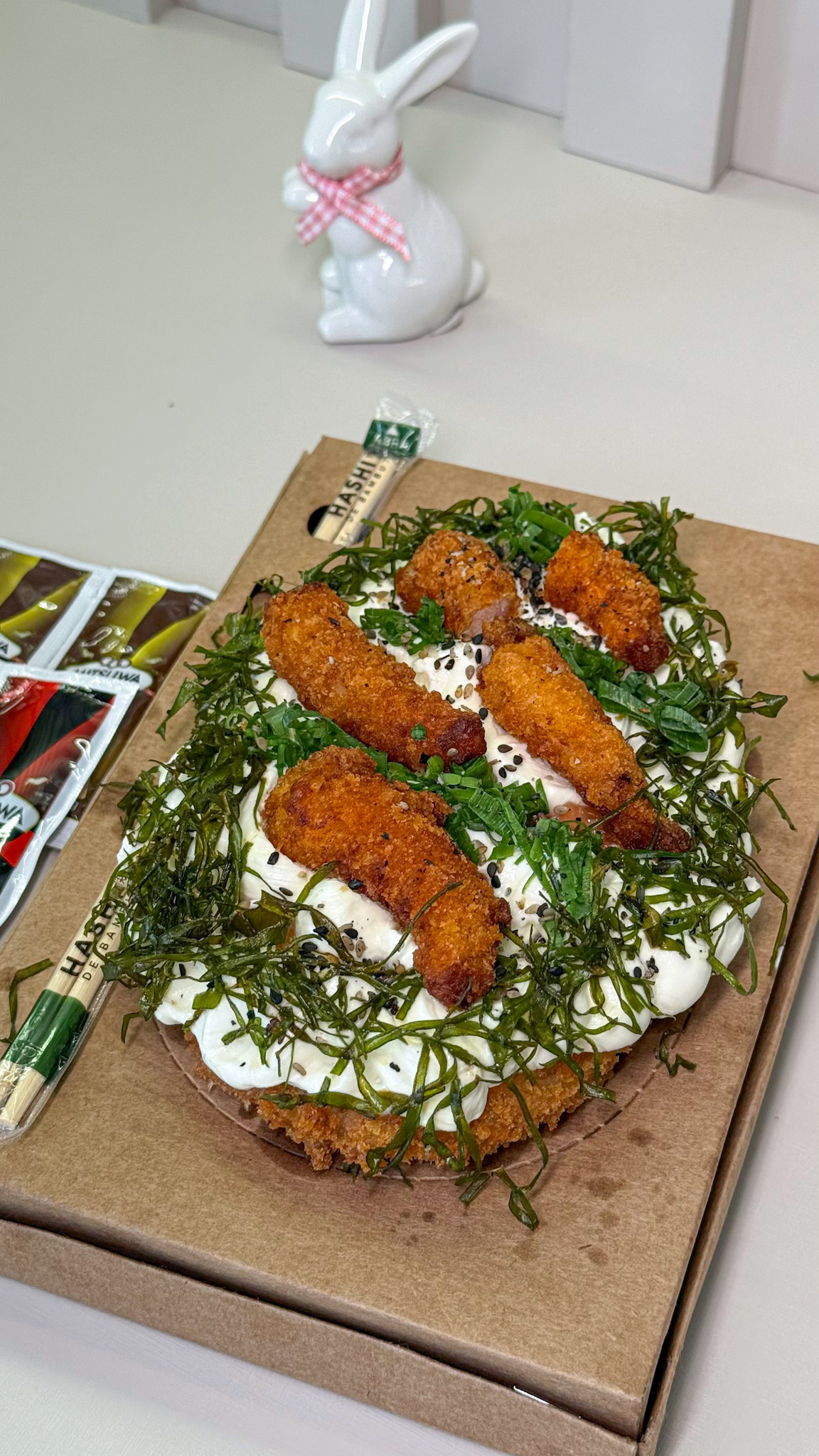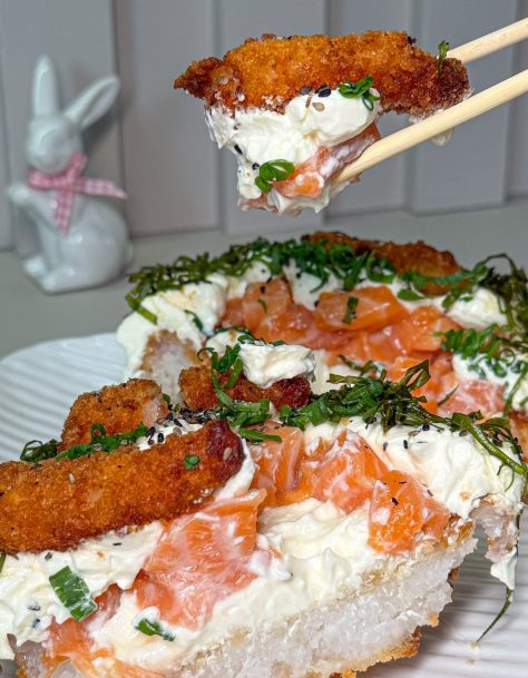 Experimentamos o sabor Premium, feito com salmão cru ou grelhado, camarão empanado, cream cheese, finalizado com couve crispy, tarê e gergelim. Toda a nossa família é apaixonada por comida japonesa. Então esse ovo foi uma perdição pra nós. Entregou uma base crocante, muita cremosidade na cobertura e o frescor do salmão. A couve crispy fechou com chave de ouro!