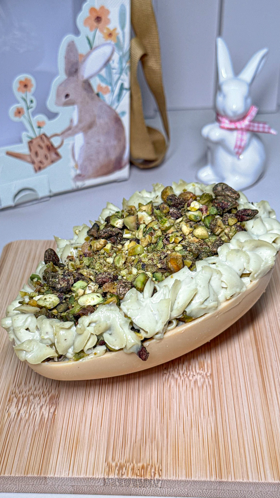 Um deles é recheado de creme de pistache super cremoso e suave, decorado com cookie Bites, que trazem o charme ao ovo. O outro recheio foi de Ninho com Nutella, finalizado com docinhos. O nosso filho mais novo se apaixonou por esse! Estavam realmente impecáveis.