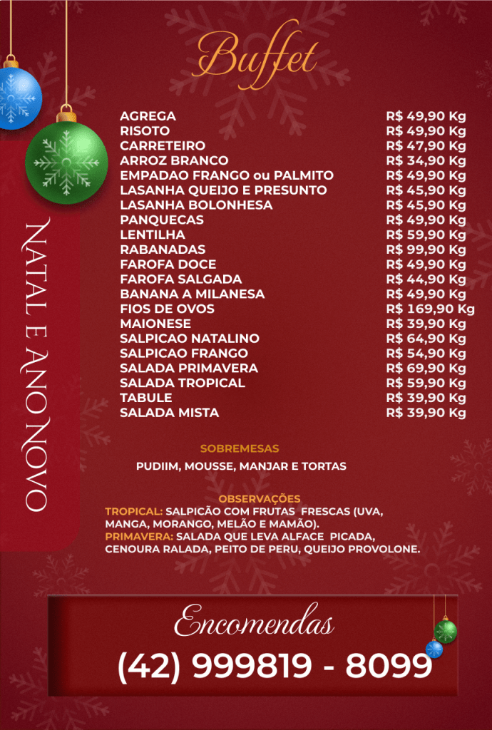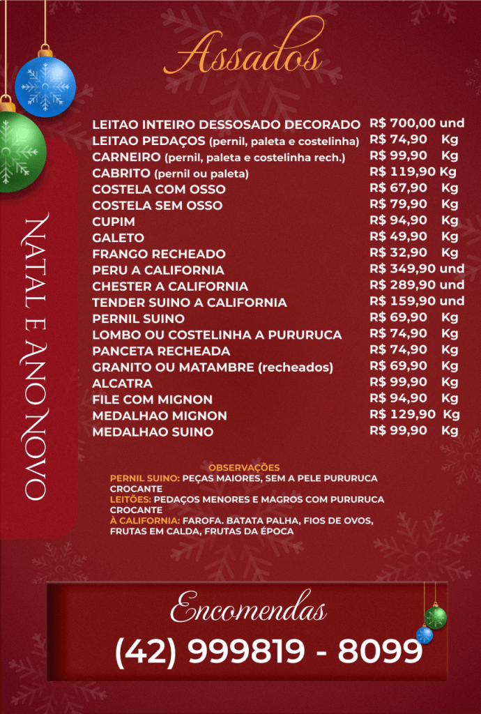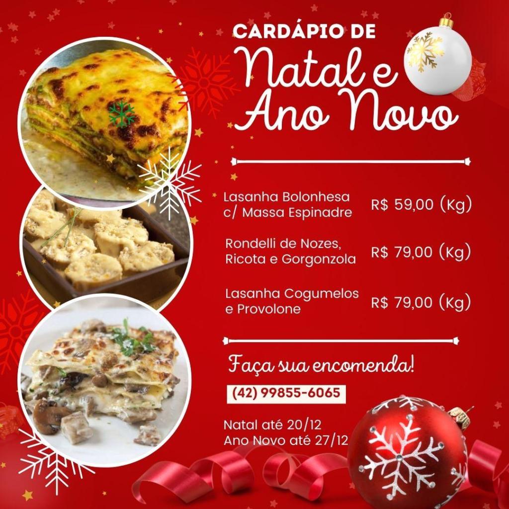 A Costela e Cia trabalha com um cardápio bem variado para celebrar as duas datas: Natal e Ano Novo. Tem várias opções, entre carnes assadas, massas, saladas e guarnições. As encomendas só serão aceitas na unidade do Centro, próximo a UEPG.