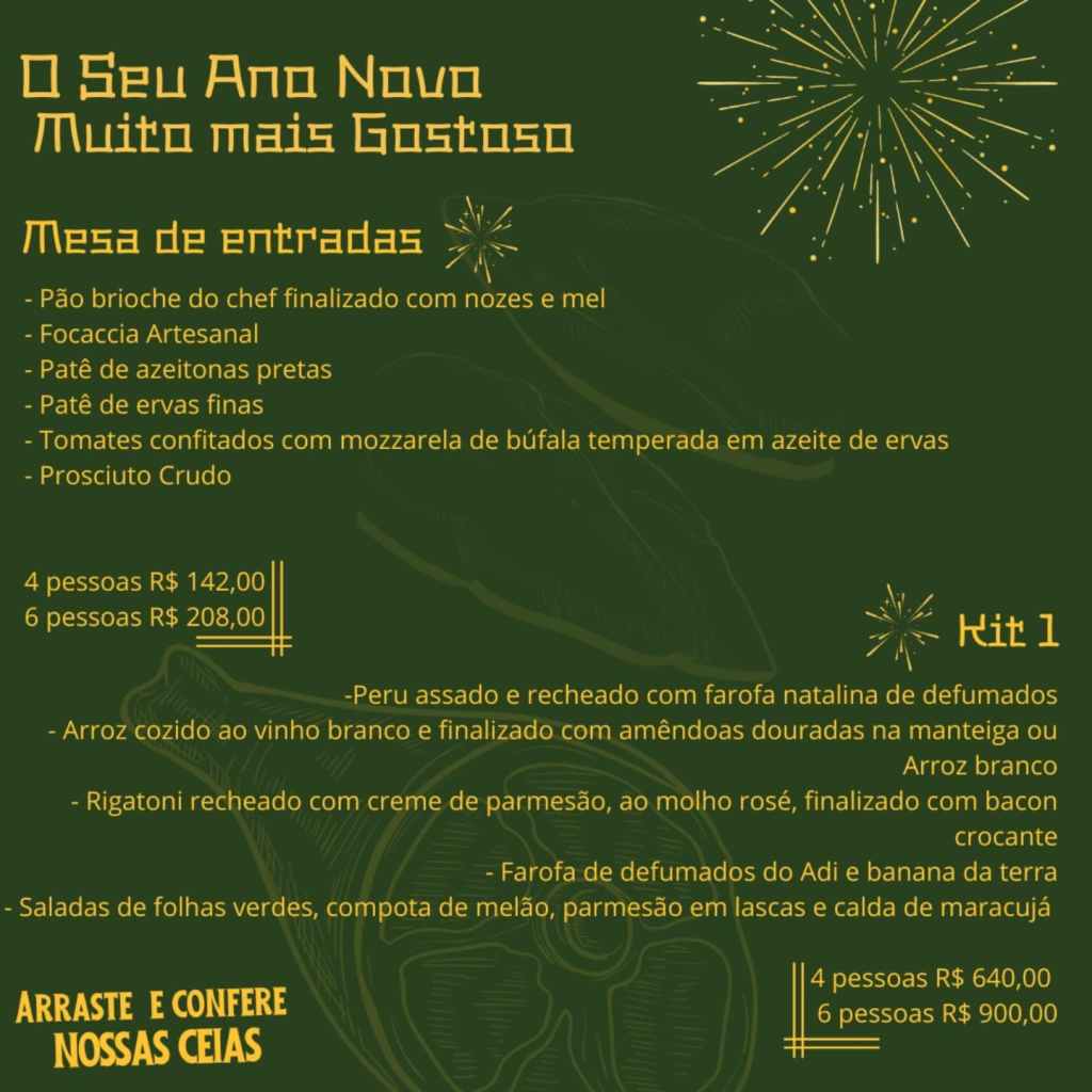 Neste ano, o experiente Cheff Adal irá receber encomendas para as ceias de Natal e de Ano Novo. Ele está oferecendo opções de kits para 4 ou para 6 pessoas, além de mesa de entrada e sobremesas.
