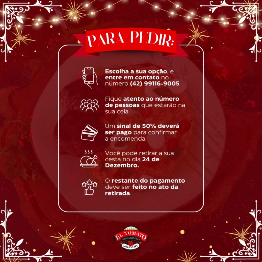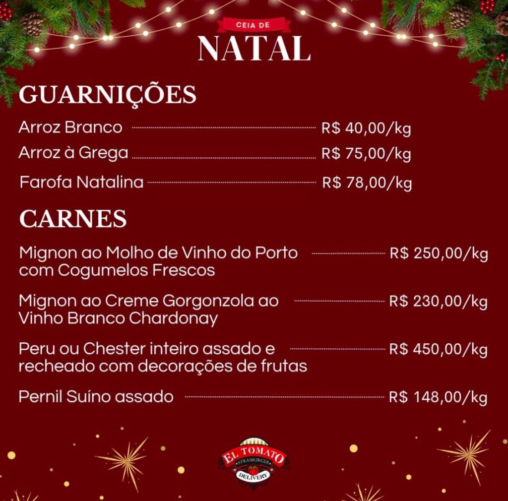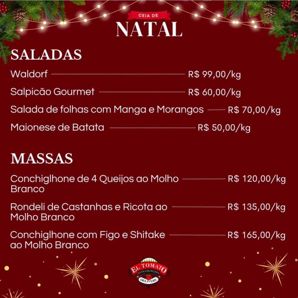 O El Tomato irá trabalhar com um cardápio especial de Natal, com saladas, carnes, guarnições e massas. É preciso fazer o pagamento de 50% do valor para confirmar o pedido.