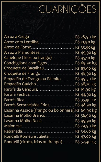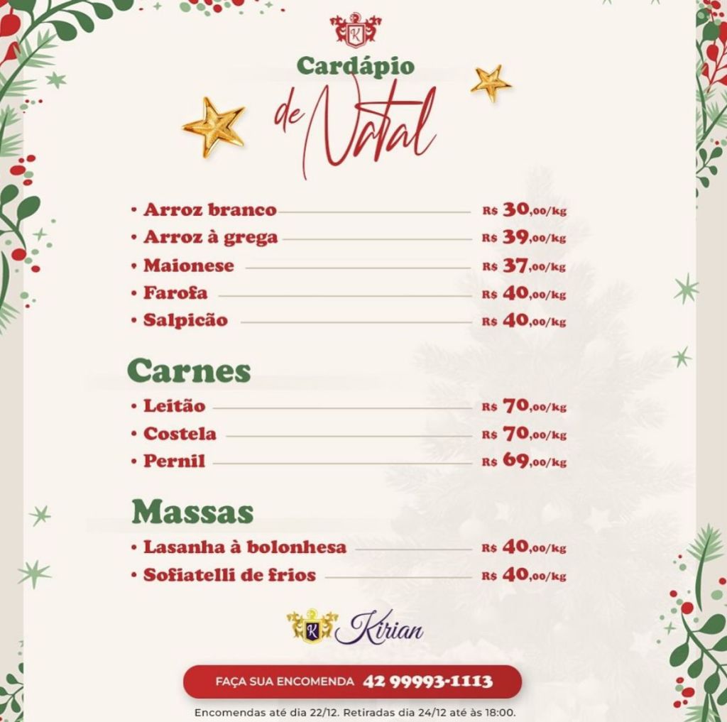 A Kirian Festas e Eventos preparou um menu especial para a celebração da ceia de Natal, com carnes, massas e acompanhamentos.