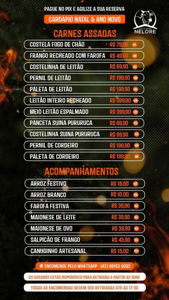 A Casa de Carnes Nelore preparou um cardápio com mais de 10 tipos de carnes assadas e acompanhamentos. Será possível encomendar tanto para o Natal quanto para o Ano Novo.