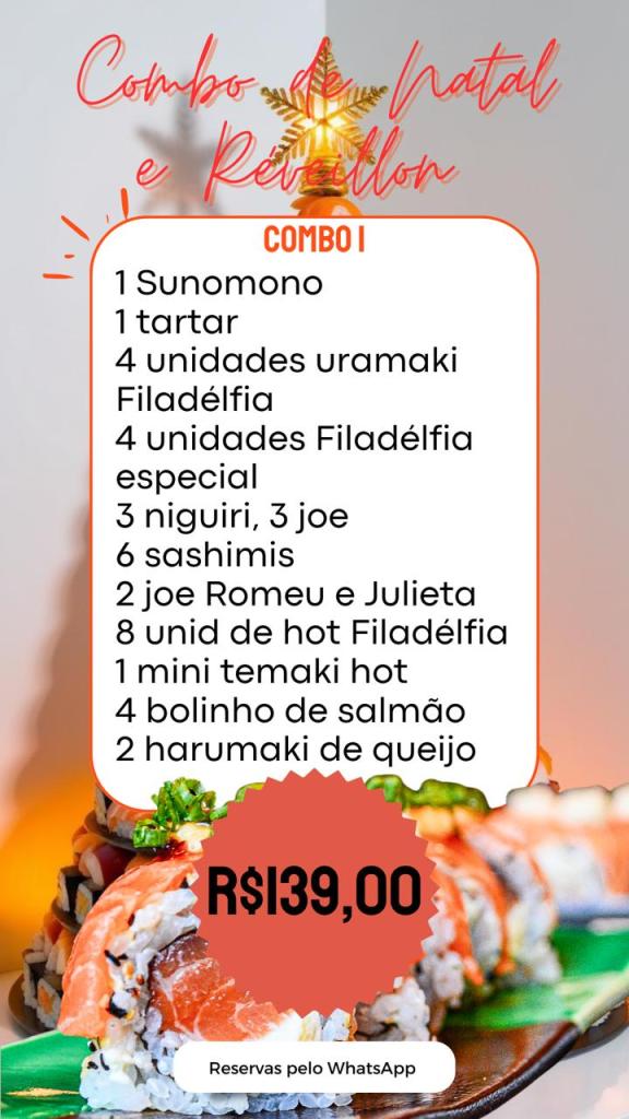 O Sennin Sushi oferece uma proposta de ceia oriental, com opções de combinados com sushi e sashimi para o jantar de Natal e de Ano Novo.
