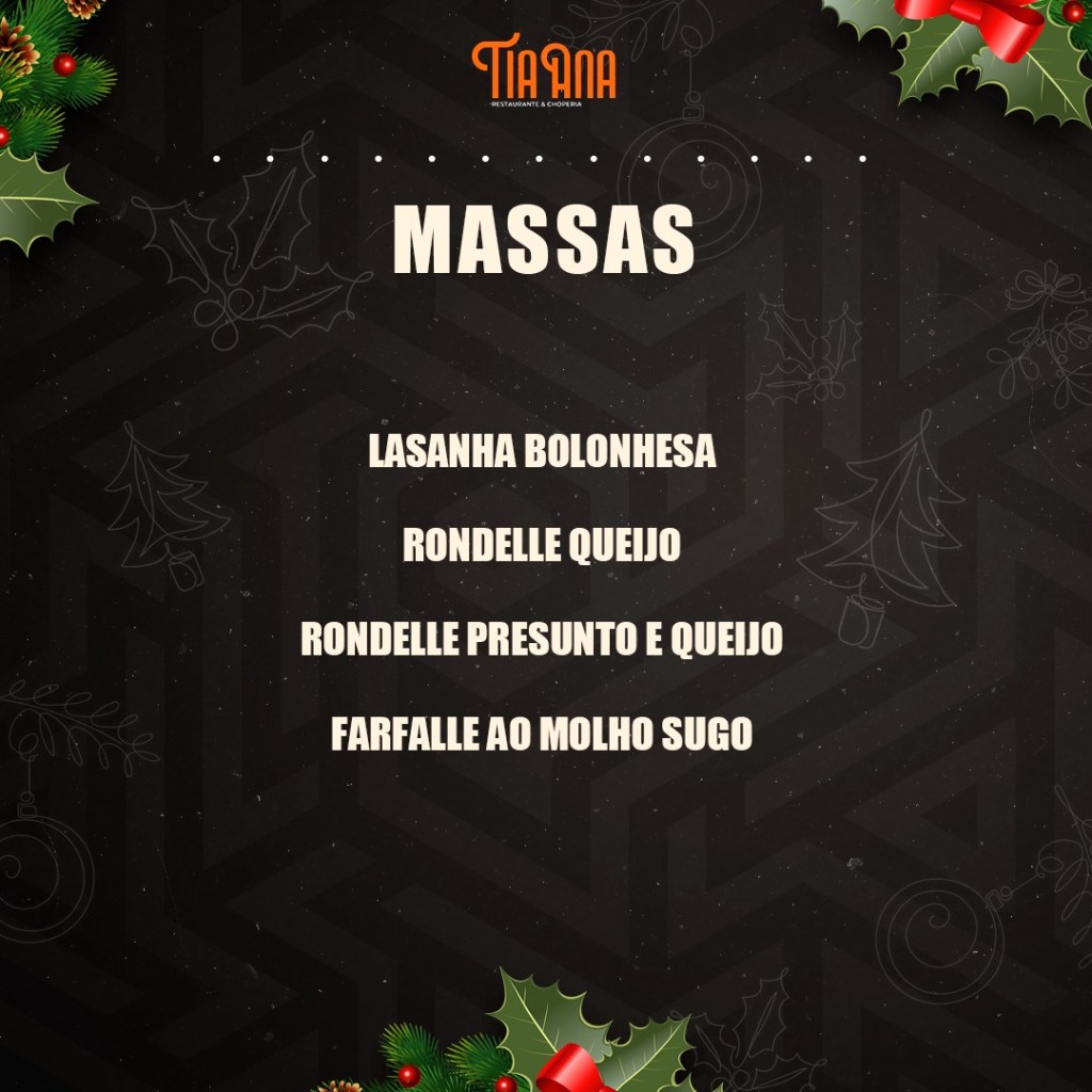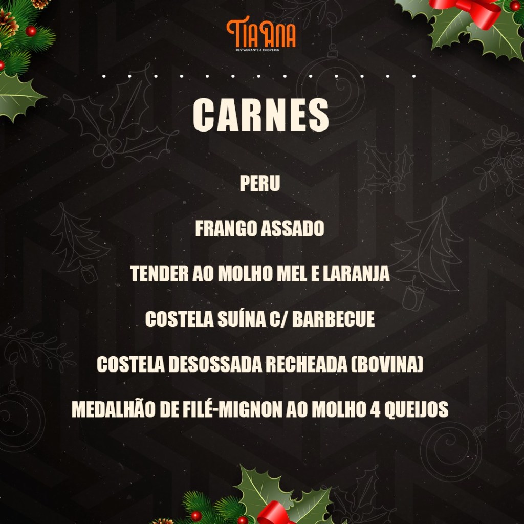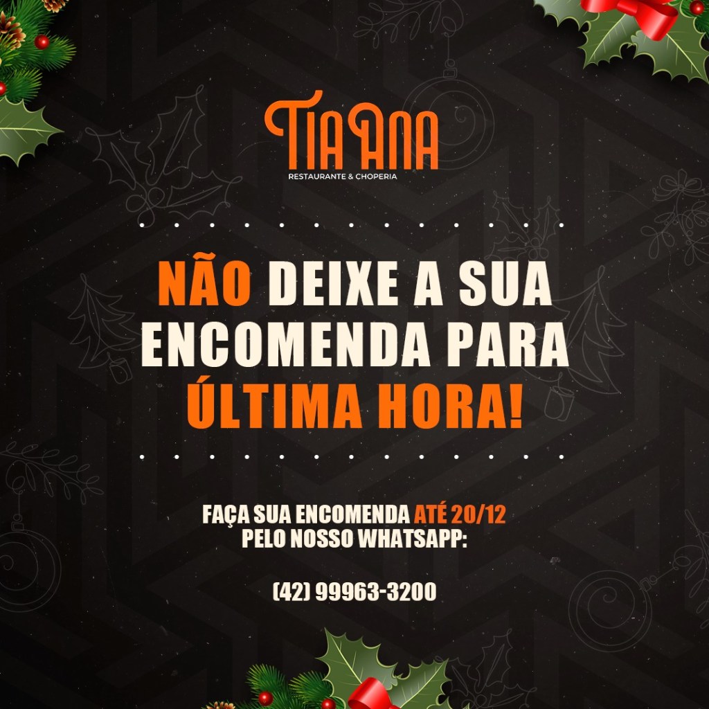 O Restaurante Tia Ana, localizado em Oficinas, vai oferecer um cardápio para que você monte a sua ceia de Natal. As opções reúnem carnes, massas, saladas e sobremesas.