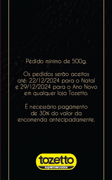O Supermercados Tozetto aceita encomendas de pratos salgados e doces o ano todo, mas, para o Natal e o Ano Novo, existem produtos diferenciados. Para pedir, é necessário ir diretamente à Rotisseria ou à Confeitaria da loja de sua preferência e fazer a encomenda desejada. O pedido mínimo é de 500g. É necessário o pagamento de 30% do valor da encomenda antecipadamente.