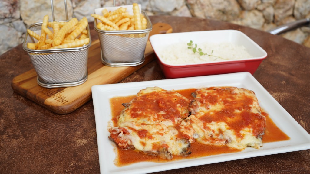 1- Bife a parmegiana – Bife de Mignon gratinado com molho de tomate e queijo, acompanha arroz branco e batata frisé