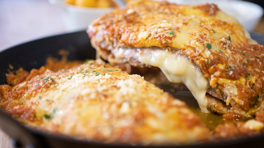 1- Filetto Mamma Mia gratinado – contrafilé à milanesa de parmesão, coberto com penne artesanal, molho Duo (4 queijos e Pomodoro), gratinado ao forno.