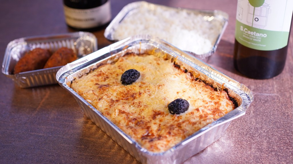 1- Bacalhau Gratinado às Natas: lascas de bacalhau refogados em azeite extra virgem com batatas, cebolas e nata fresca, gratinados com queijo parmesão. Acompanha: 02 un de bolinho de bacalhau e arroz branco.