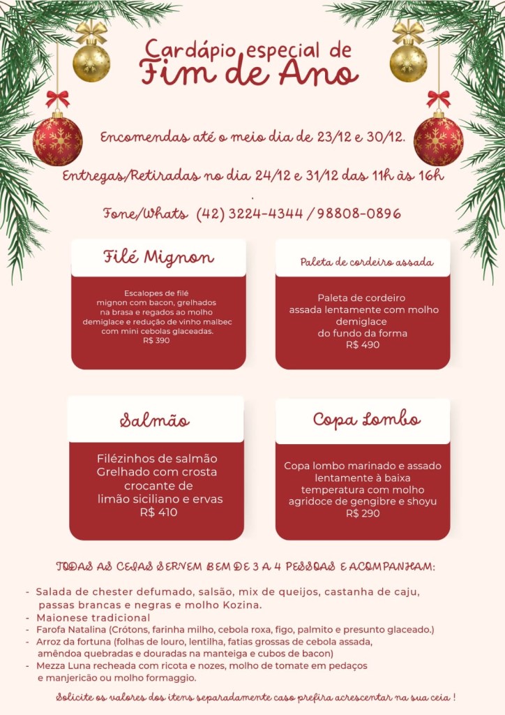 As encomendas para o Natal podem ser feitas até o dia 22. Para o Ano-Novo, até o dia 28. Os pedidos feitos até o dia 17 terão 10% de desconto. Os pratos podem ser encomendados pelo WhatsApp (42) 99163-0953.