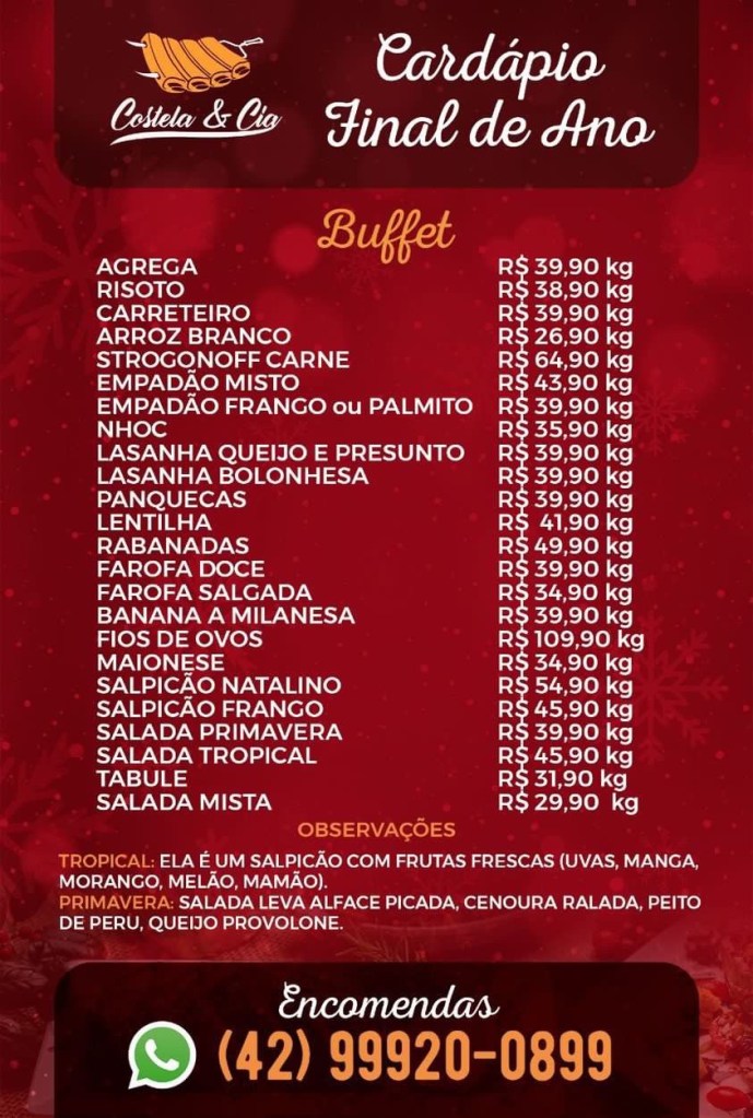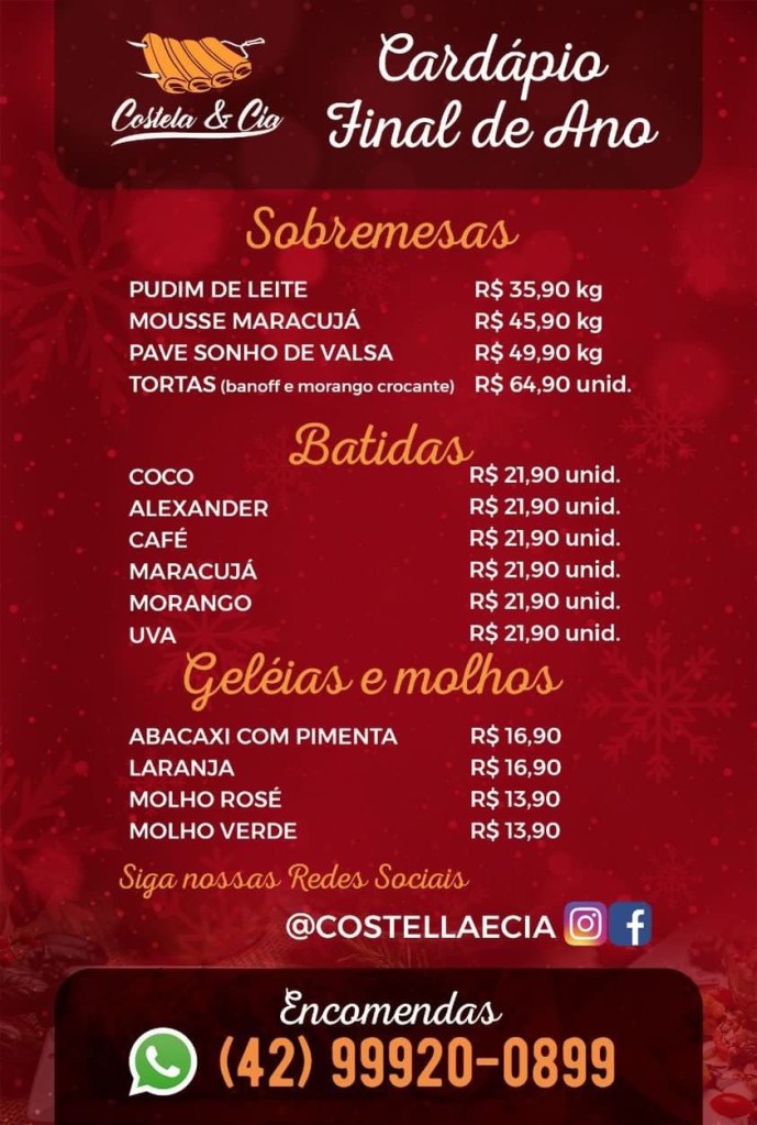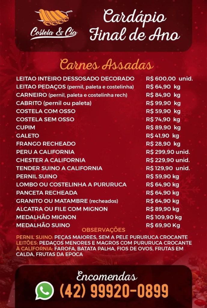A Costella e Cia é um estabelecimento bastante apreciado pelos ponta-grossenses, que conhecem a variedade e sabor dos assados e pratos quentes. Para este fim de ano, preparou um menu especial para ceias de Natal e Réveillon, assim como para o almoço.