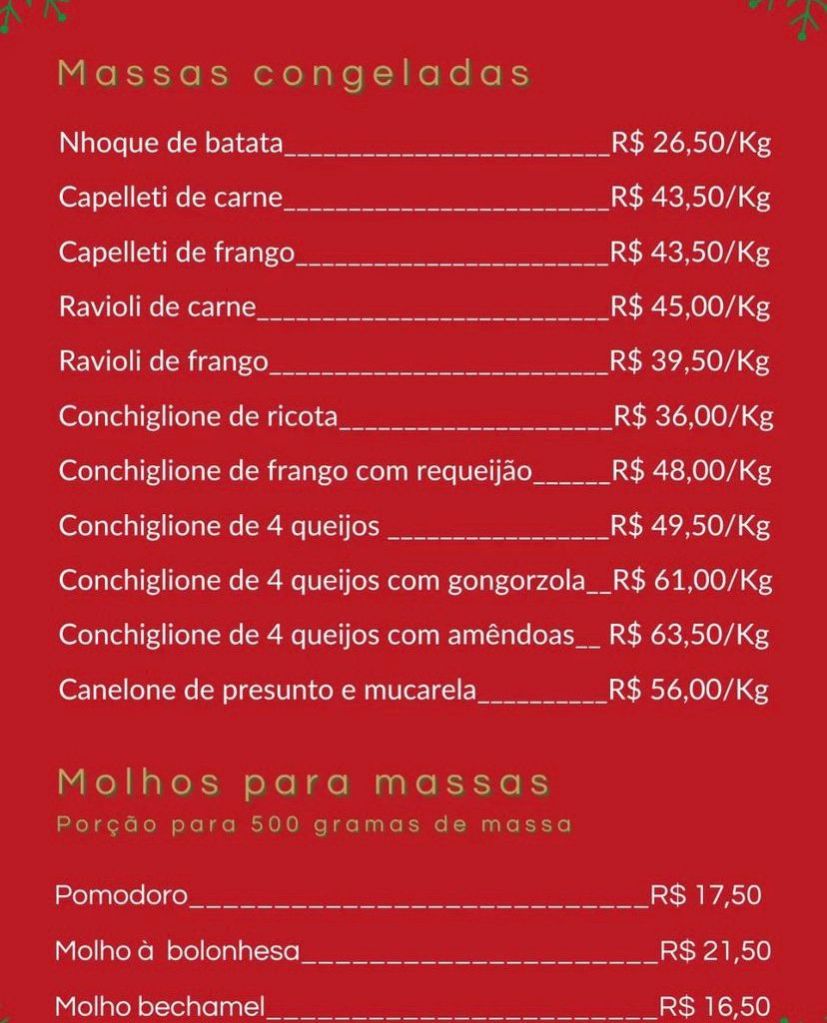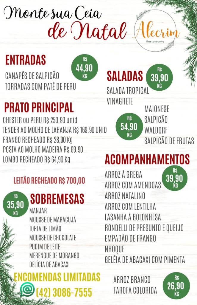 Para este Natal, será possível encomendar assados, guarnições, massas congeladas e molhos para as massas. Os pedidos serão aceitos até o dia 18 pelo WhatsApp (42) 99857-0508 ou (42) 3301-8501. Haverá apenas a opção de retirada das 17h30 às 19h30.