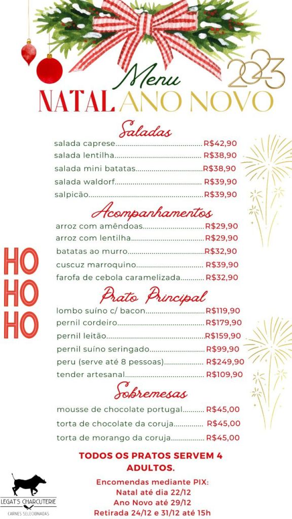 A Legat’s Charcuterie é um estabelecimento dedicado a carnes selecionadas para o churrasco perfeito e utensílios. Para o Natal e o Ano-Novo, oferece um cardápio de saladas, acompanhamentos, prato principal e sobremesas. Todos os pratos servem 4 adultos.