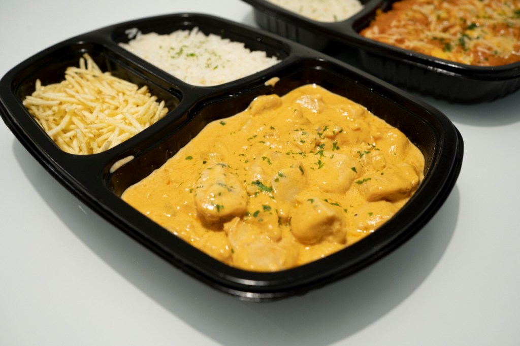 Strogonoff de frango é feito com champignon e acompanhado de batata palha e arroz e refrigerante/Foto: Willian Chomexem