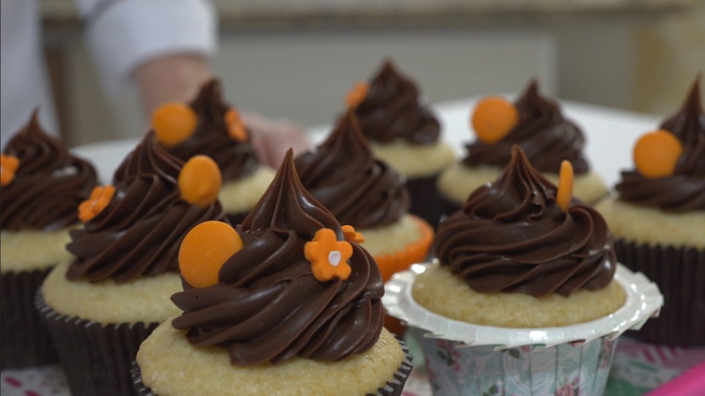Para elaborar a receita, a Doce Confeitar forneceu dois produtos obrigatórios para constar entre os ingredientes: callets da Callebaut sabor laranja e farinha de amêndoas. “Eu queria elaborar uma receita que fosse fácil das pessoas fazerem em casa e poderem usar como base para produzirem outros sabores”, explica. Sendo assim, a Denise criou um Cupcake de amêndoas com brigadeiro de laranja e cobertura de chocolate com café.