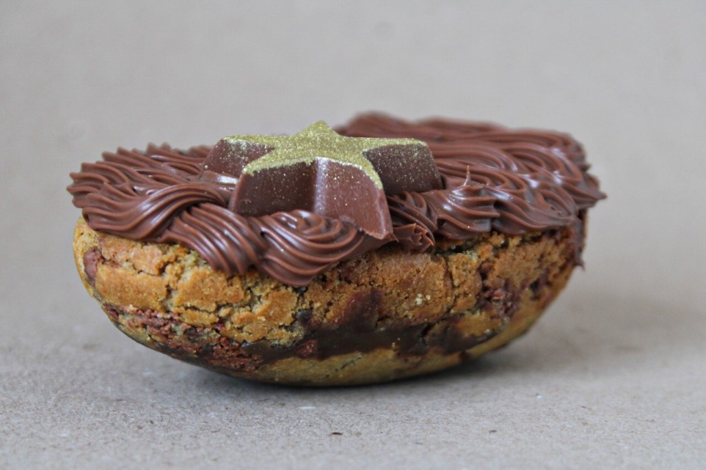 A casca do ovo é feita de cookie de baunilha com gotas de chocolate ao leite, blindado com blend de chocolate nobre, uma camada de creme de leite ninho, que é um brigadeiro suave, pedacinhos de cookie de baunilha com gotas de chocolate ao leite, finalizado com Nutella e a estrela da magia.