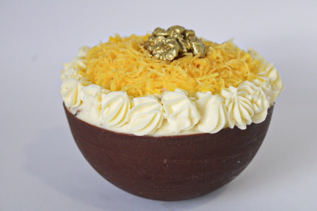 Importante dizer que a casca de chocolate é no formato redondo, diferente dos ovos tradicionais, atribuindo charme ao produto. Ele pesa 300g ao valor de R$ 80.