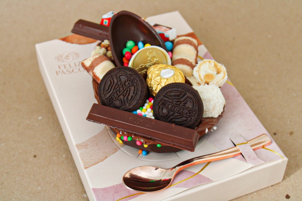 Para este ano, a Nicoli, proprietária da confeitaria, está apostando em uma novidade: o Ovo Mix Delitudo. Nele, vai a casca de chocolate meio amargo, camada de Nutella, recheio preto e branco de Kinder, recheio Ferrero Rocher, recheio de Raffaello com amêndoas, decorado com KitKat, Ferrero Rocher, Kinder Bueno, Kinder barrinha, Raffaello, casca de ovo com confetis e bolacha Oreo. O peso deste ovo é 500g e tem o valor de R$ 69,90.