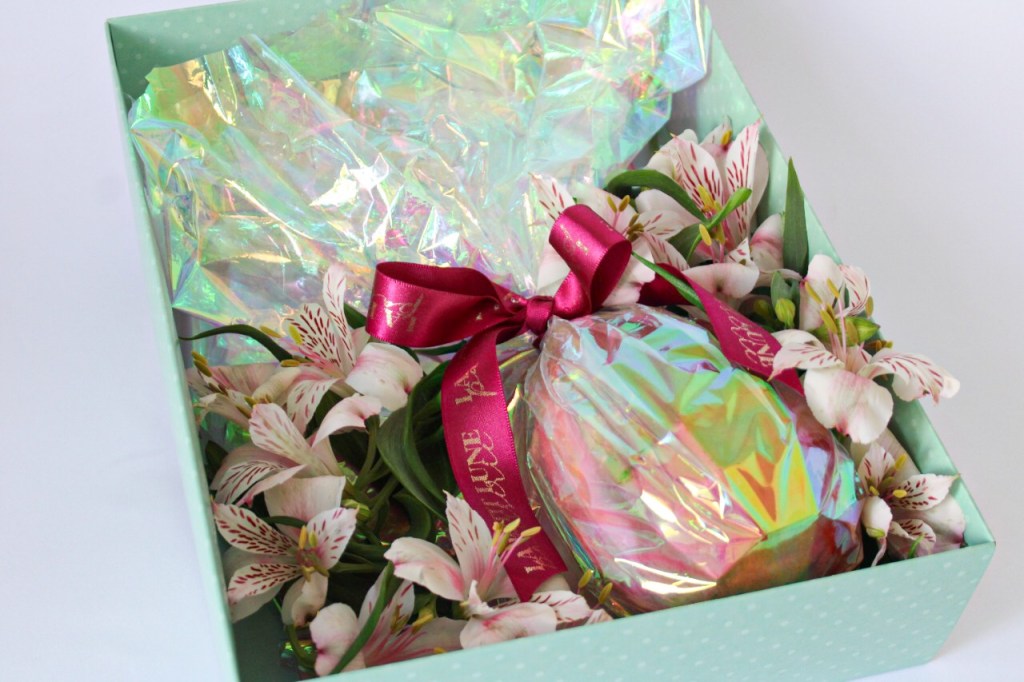 Para a Páscoa, ela apresenta o ovo da Linha Encanto, com casca recheada de pistache com framboesa. Ele é feito com chocolate branco belga, geleia artesanal de framboesa e ganache de pistache. Vai em uma caixa cartonada acompanhada de flores naturais.
