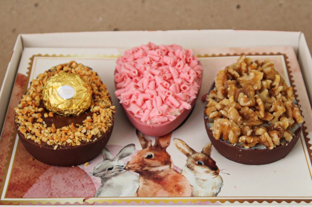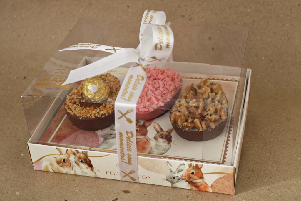 Para esta Páscoa, ela apresenta o Trio de Ovos, com cada um pesando 150g. Os recheios selecionados foram: