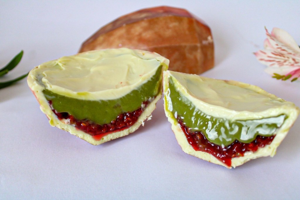 É maravilhoso, não é? Se os olhos já se encantam pela caixa e ao ver o que tem dentro, imagine o sabor! A casca lembra a lapidação de diamante, com uma pintura delicada. O recheio tem essas cores vivas, chamando muito a atenção. O sabor é indescritível, sendo impossível parar de comer.