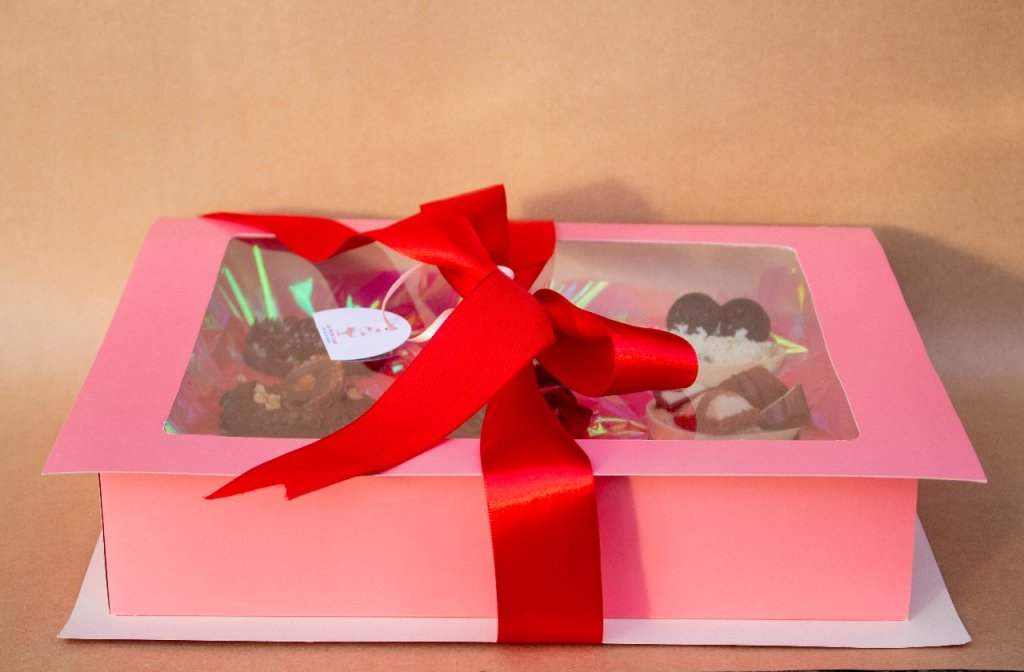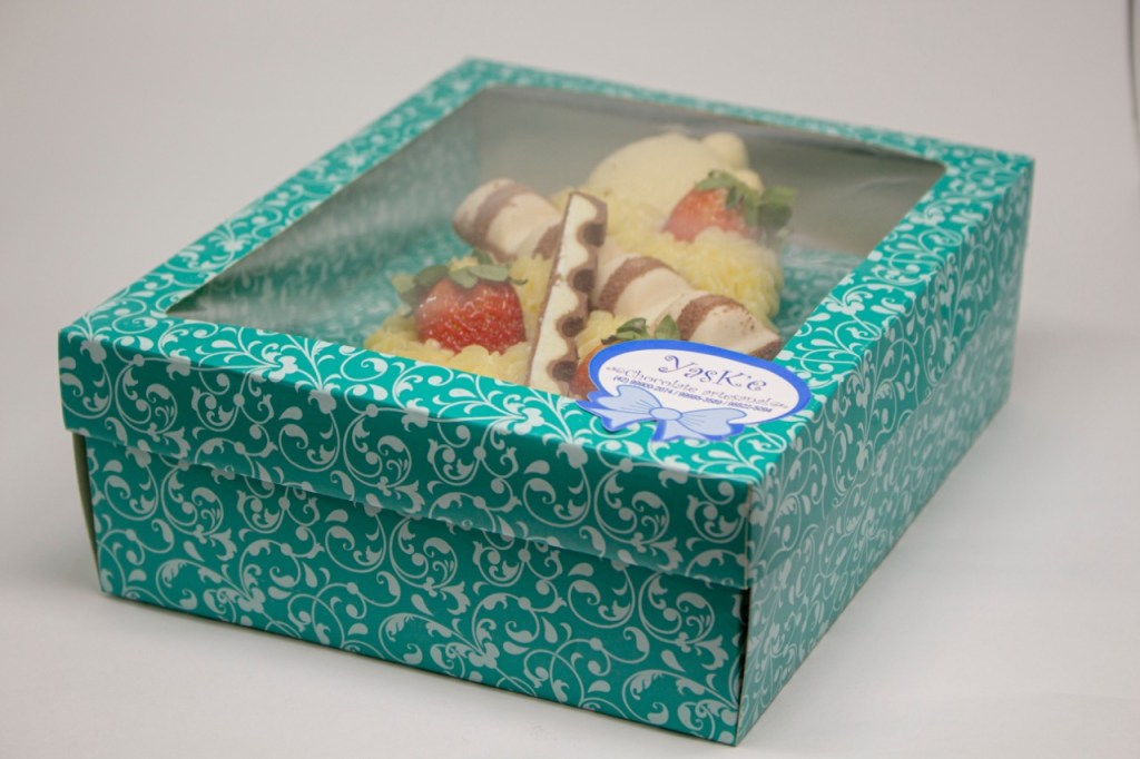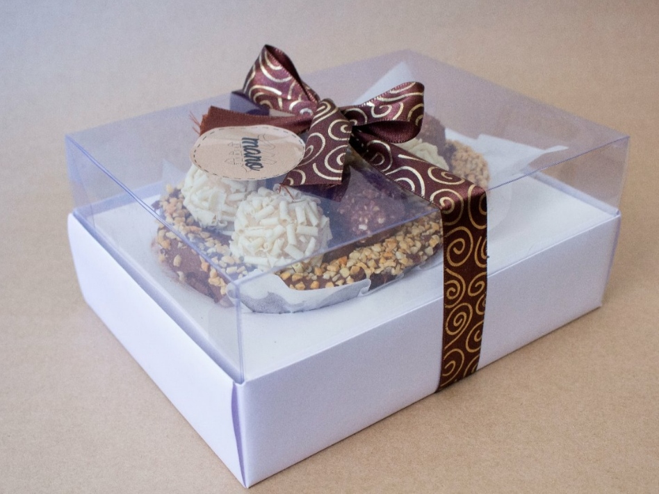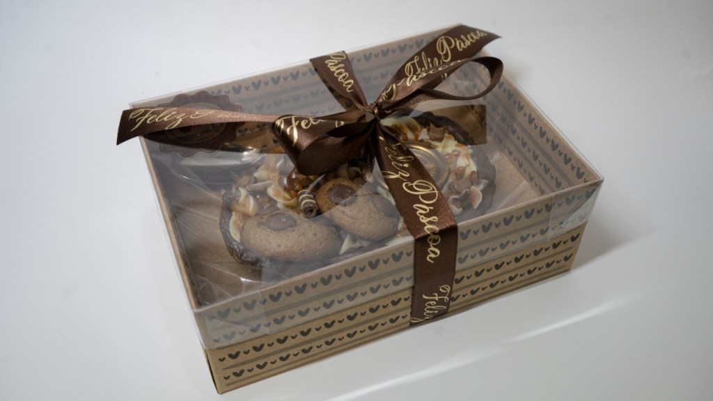 Uma caixa linda, personalizada, repleta de ovos de 50 g com sabores variados. Uma fileira é de ovos brancos (Laka com Oreo, Kinder e Rafaello), outra é de chocolate com casca meio amarga (Sabor do Brasil – Castanha do Pará e Coco, Trufado e Maracujá trufado) e a outra com casca ao leite (Ninho com Nutella, Ferrero Rocher e Nhá Benta de Ninho com Brownie e Nutella).