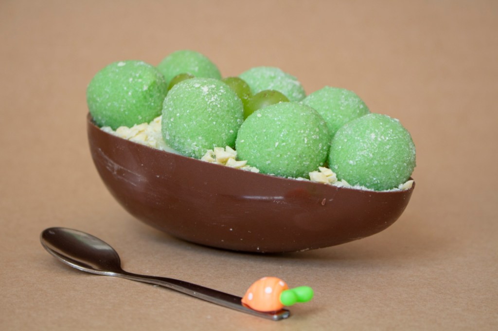 Para 2020, ela preparou o ovo de colher Surpresa de Uva. Sabe aquele docinho de festa que todo mundo ama? Sim, ele foi transformado em um ovo lindo. Leva casca de chocolate meio amargo, com recheio de brigadeiro preto e branco e fatias de uvas Thompson (sem semente). Por cima, generosos bombons de uva e mais uvas. Colorido e sabor incríveis! O peso é 400 g e o valor é R$ 39,90.