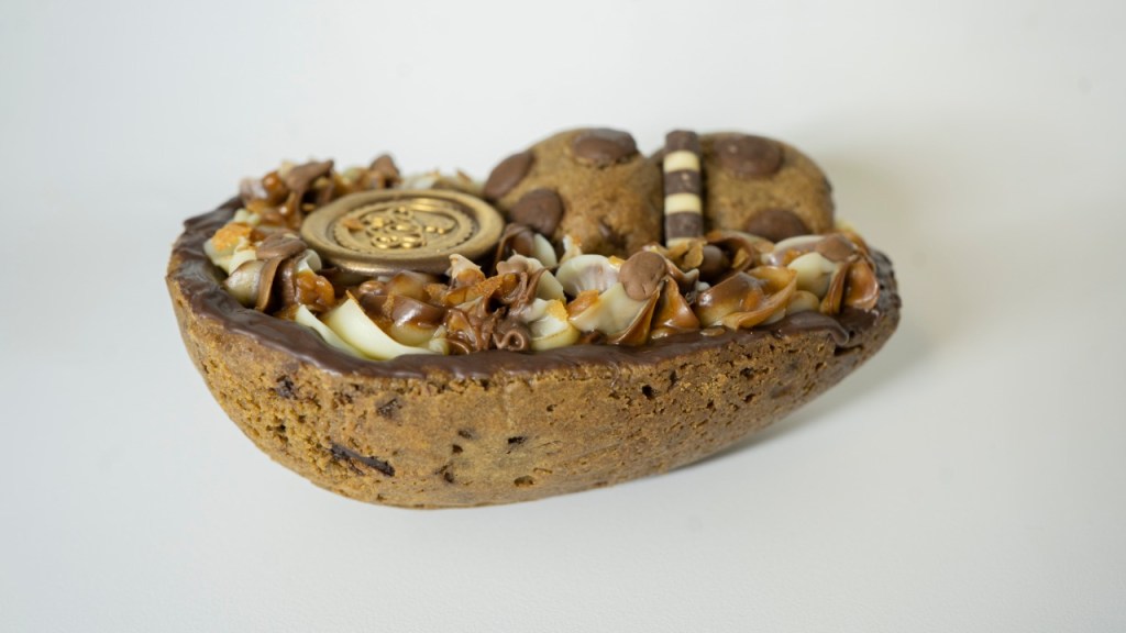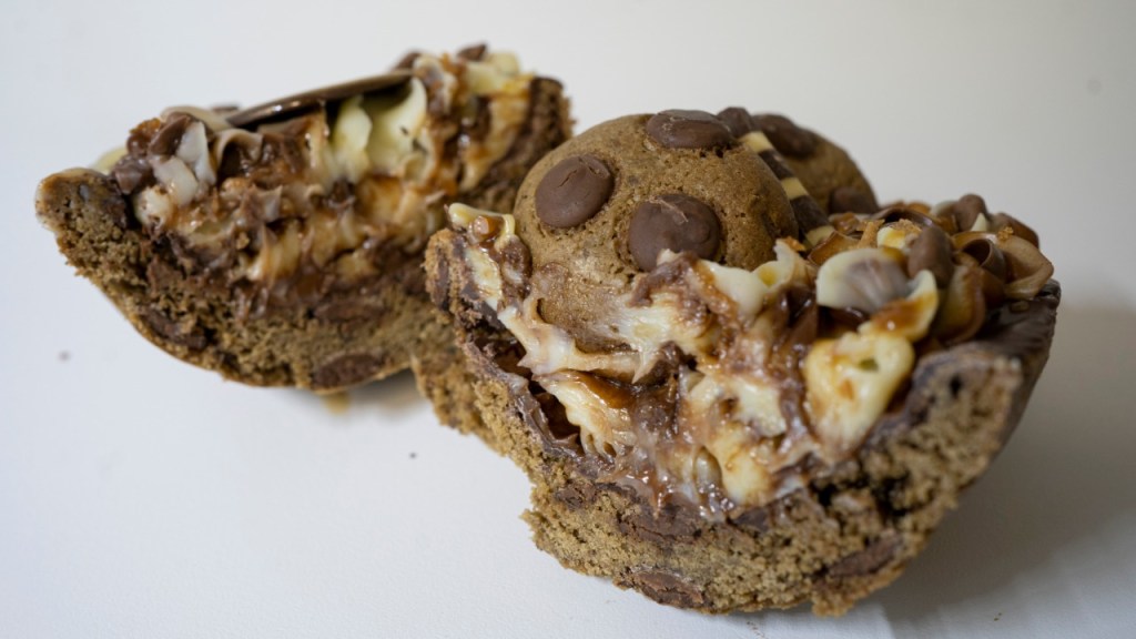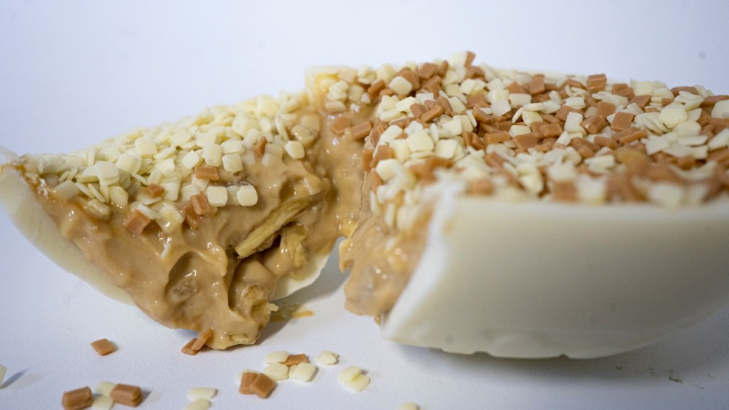 O recheio é para ser consumido com colher. É feito de leite condensado cozido – transformando naquele doce de leite espetacular – unindo a pedaços de nozes com cobertura de granulê misto e branco. A casca possui um desenho de corações, dando um toque especial. Combinação deliciosa, que está te dando água na boca, né? É imperdível.